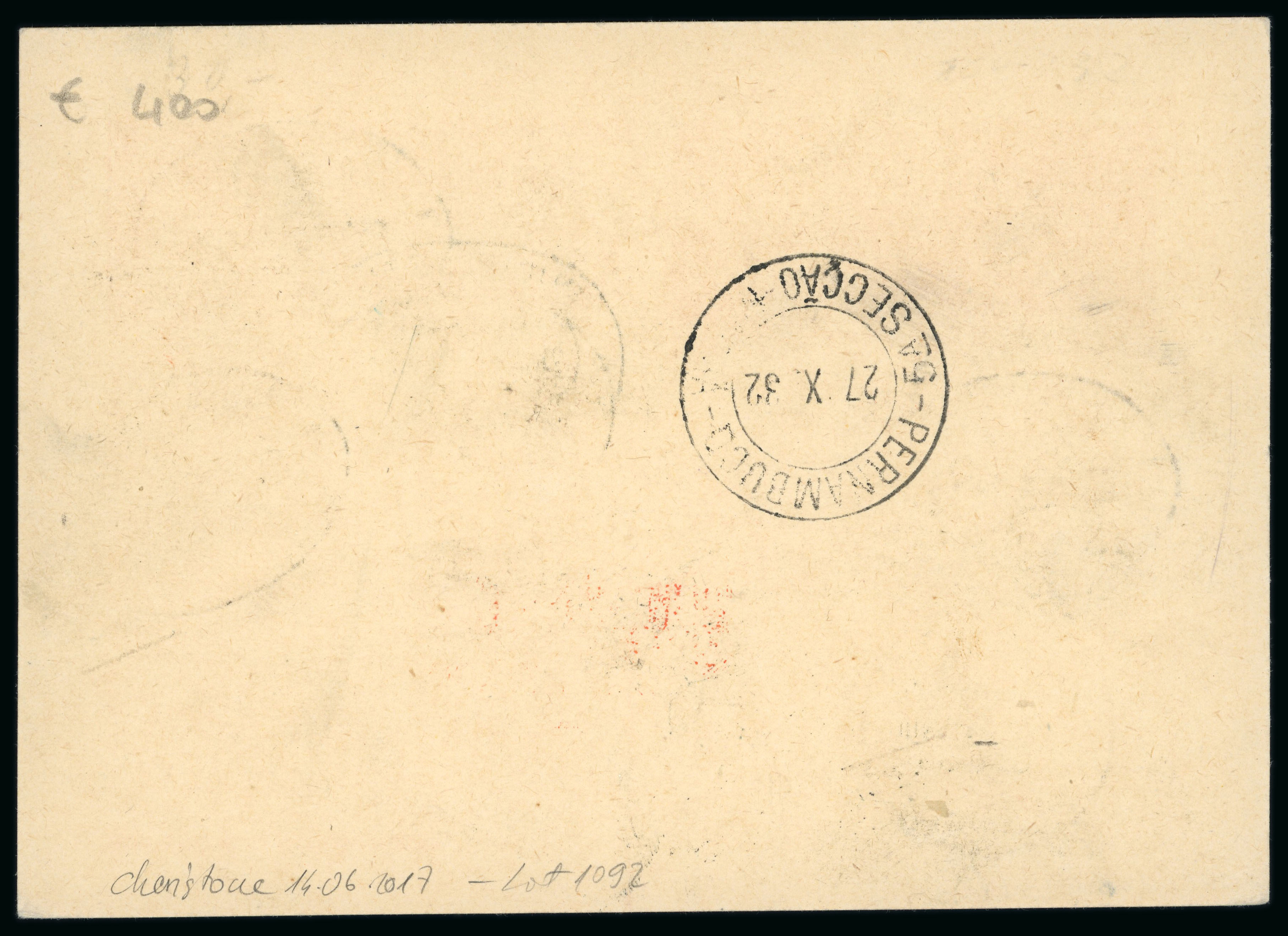 Zeppelin 1932 9th South American Flight: unusual uprated stationery postcard sent by registered airmail from Bucharest, Romania on 21/10/1932 to Recife Pernambuco, Brazil, arrival 27/10, bearing the Friedrichshafen, Germany cds (24/10)