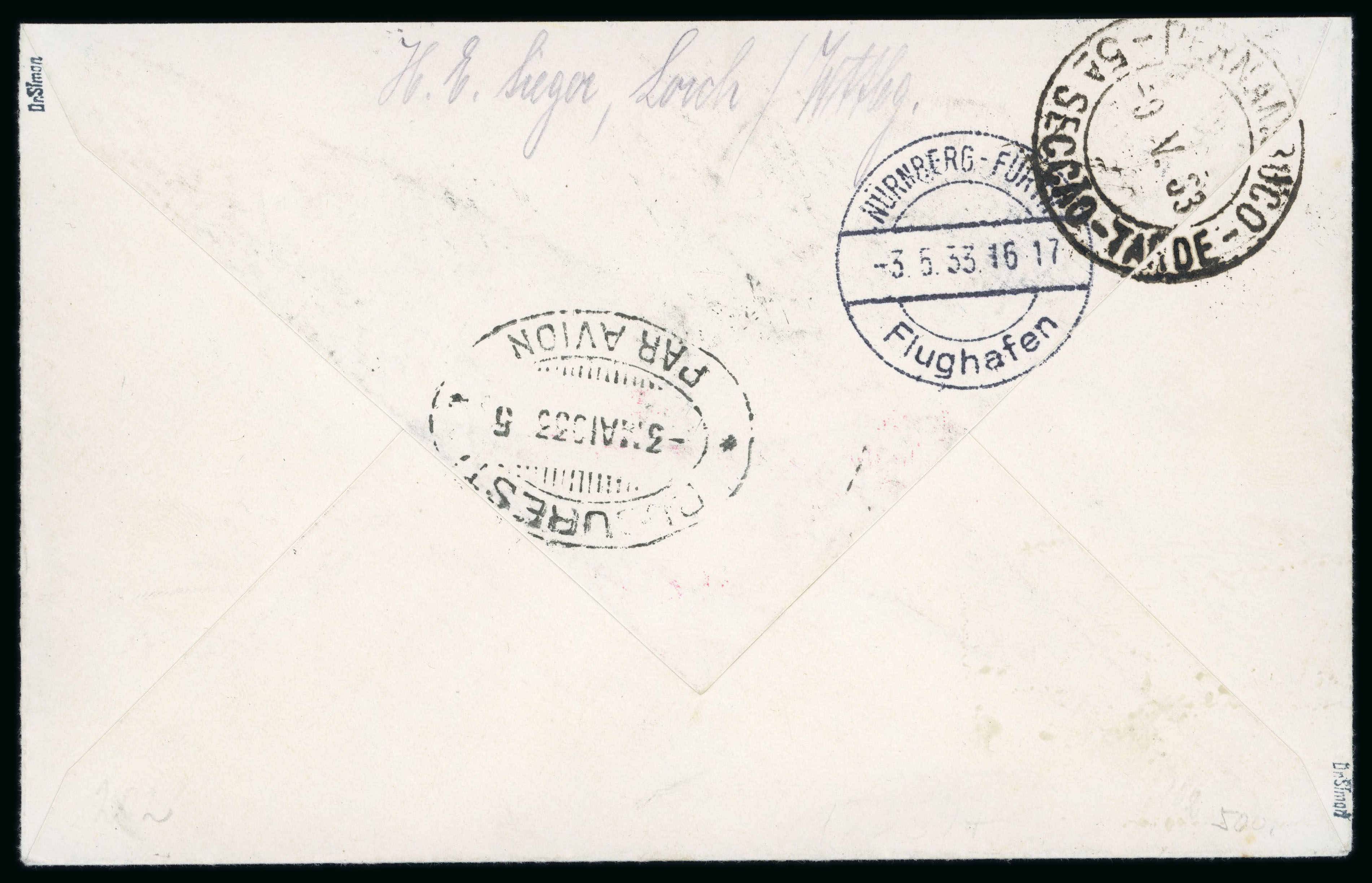 Zeppelin 1933 1st South American Flight: registered airmail cover sent by plane from Bucharest, Romania on 2/5/1933 to Recife Pernambuco, Brazil, arrival 9/5, bearing the Nurnberg, Germany cds (3/5) and the special postmark of the 4th