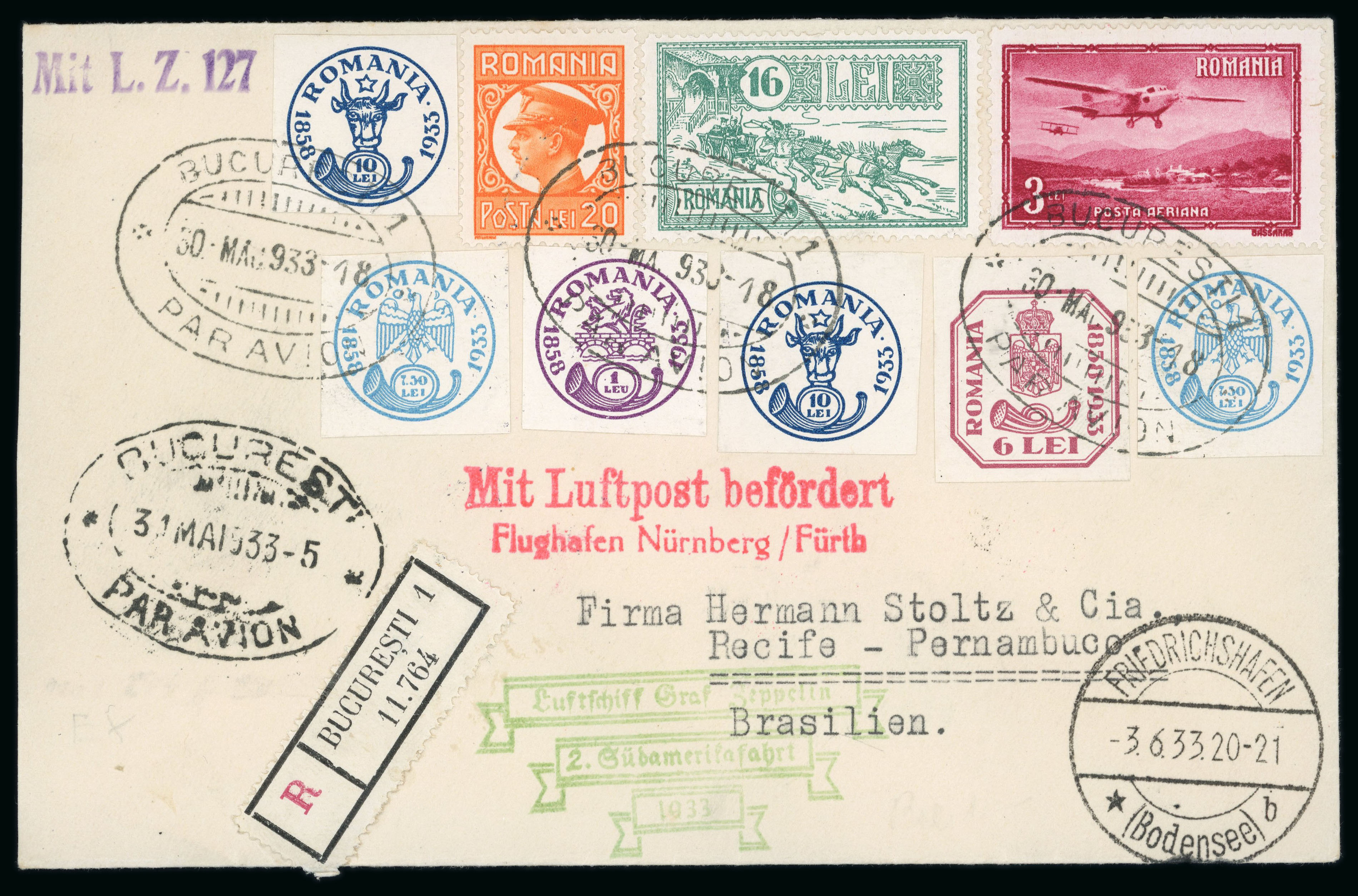 Zeppelin 1933 2nd South American Flight: registered airmail cover sent by plane from Bucharest, Romania on 30/5/1933 to Recife Pernambuco, Brazil, arrival 6/6, bearing the Nurnberg (31/5) and Friedrichshafen, Germany cds (3/6) and the
