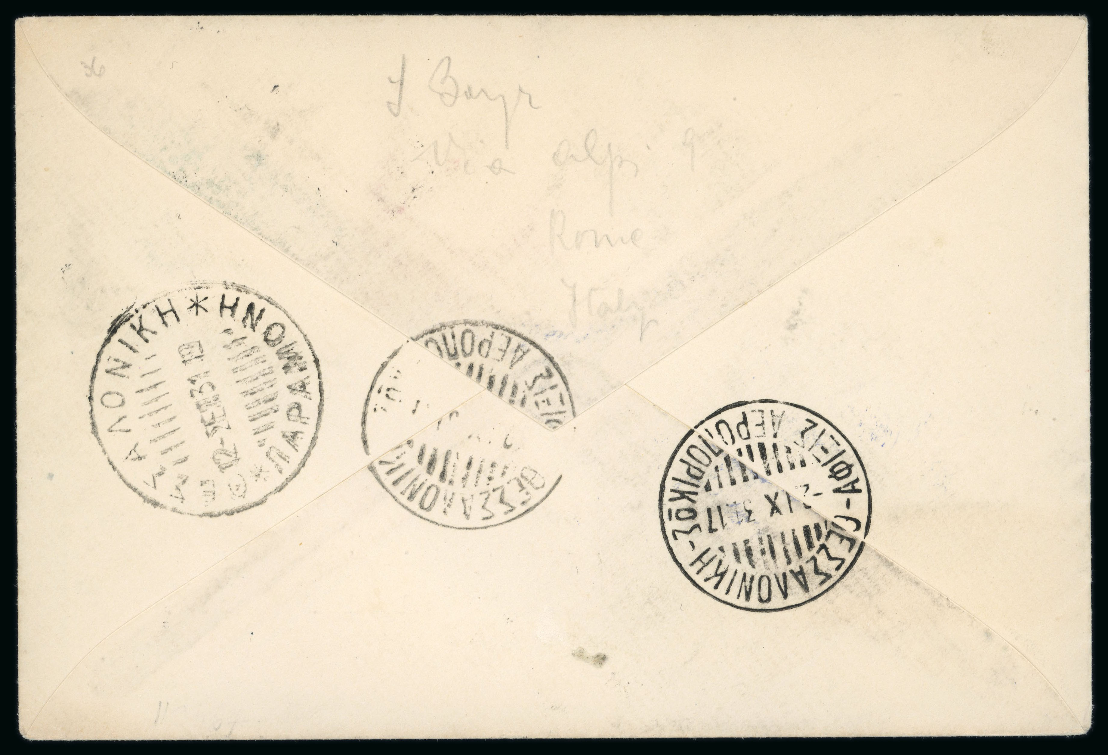 Lot of 3 airmail covers, including 12/9/1931 Bucharest to Athens, Greece with special arrival handstamp, a 4/6/1931 cover to Vienna, Austria; a 26/5/1931 cover to Germany; and one cover front of 20/7/1935 1st flight by LARES