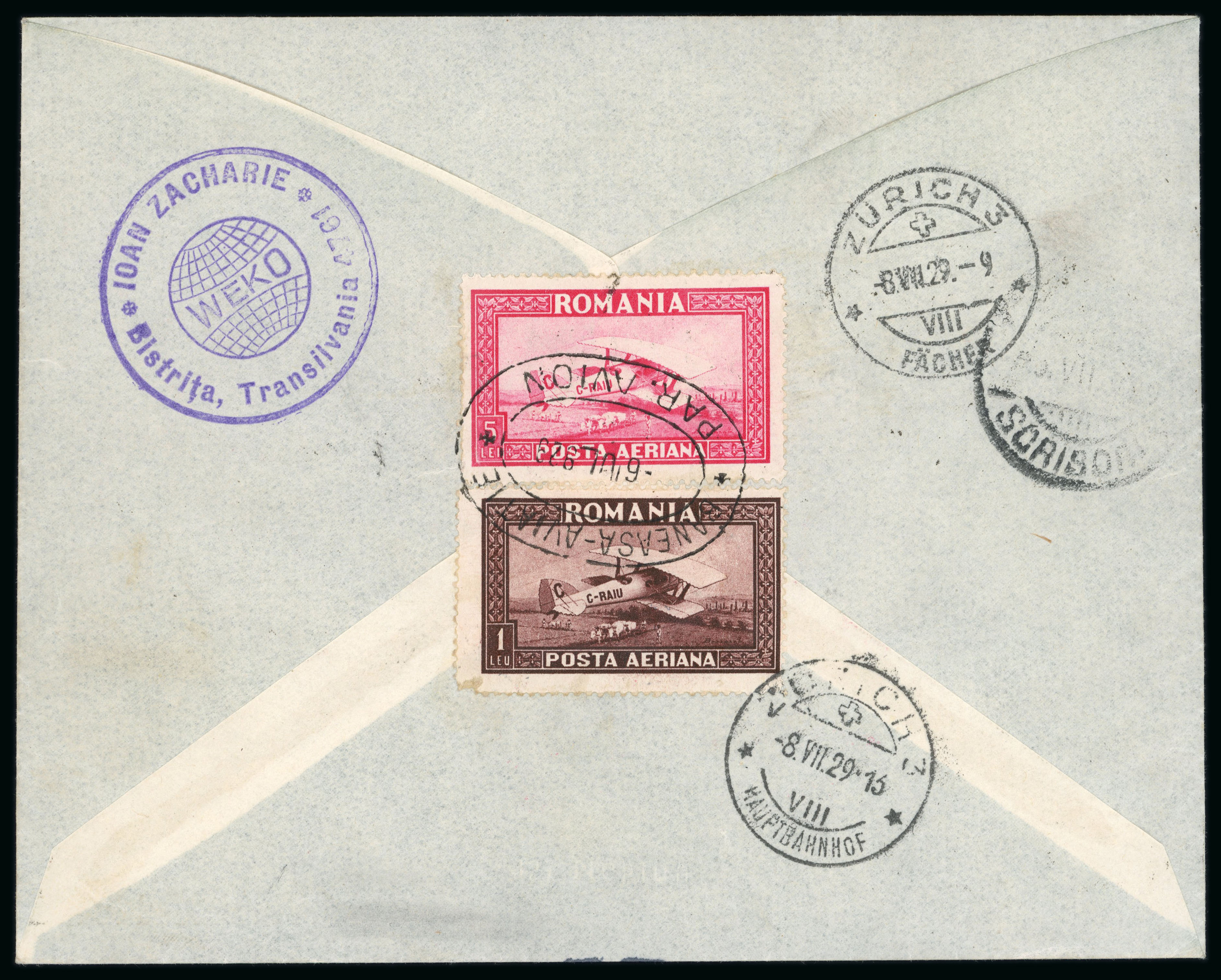 Lot of 4 airmail covers sent on 4-5 July 1929 from Bistrita, by air via Cluj-Bucharest-Vienna (Austria) to Zurich, Switzerland. They reached Cluj on the same day they were posted, and interestingly the plane stamps were only cancelled at