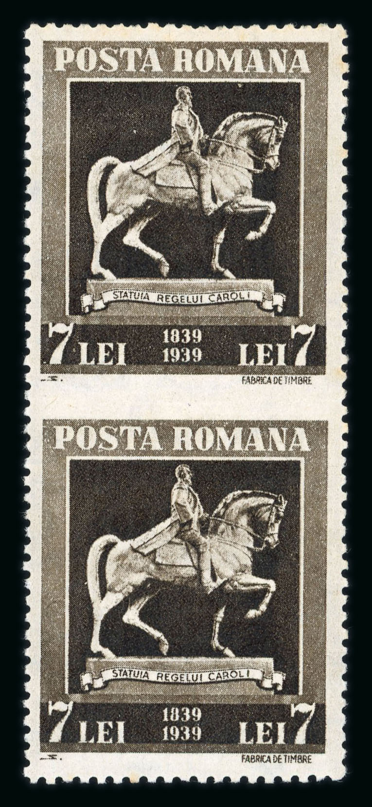 1939 King's Carol Birth Centenary Anniversary: 7L dark brown, 3 perforation errors (pair imperf between, marginal horizontally and vertically imperf), the single hinged in margin, the other never hinged, very fine. (Image 1)