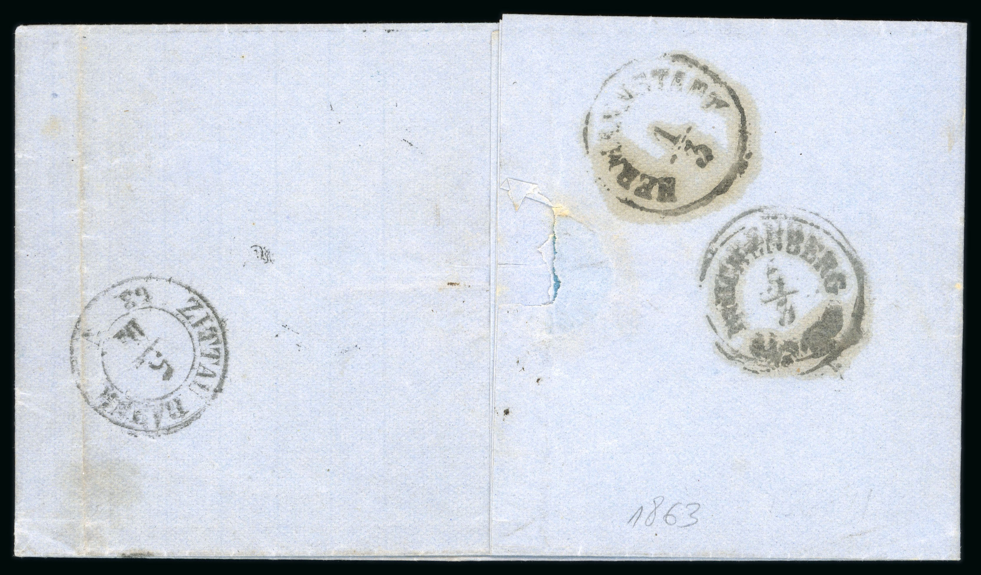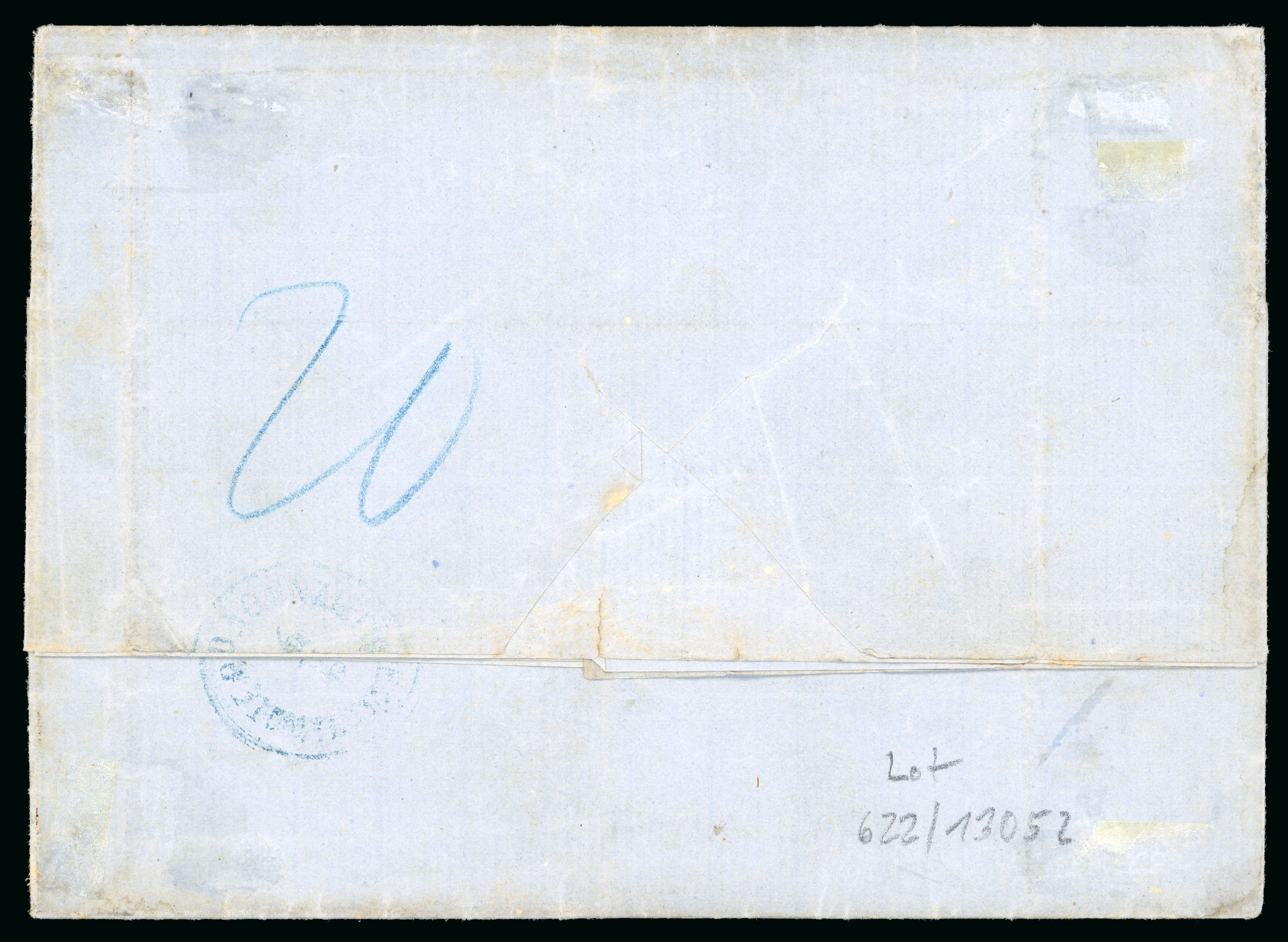 '20' decimes on arrival and the other from Galatz from 8/7/1862, cds in blue (Tchilinghirian fig. 743), taxed '10' decimes. File folds, fine. (Image 1)
