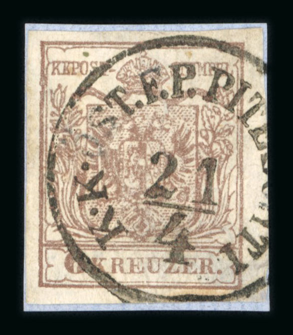 ROMAN: Superb example of the K.K.F.POST 11 postmark, Austrian FPO marking used during the occupation of Moldavia in the Crimean War, on a large-margin 6kr. brown stamp from the 1850 issue. Very fine condition. Signed Ferchenbauer, cert.