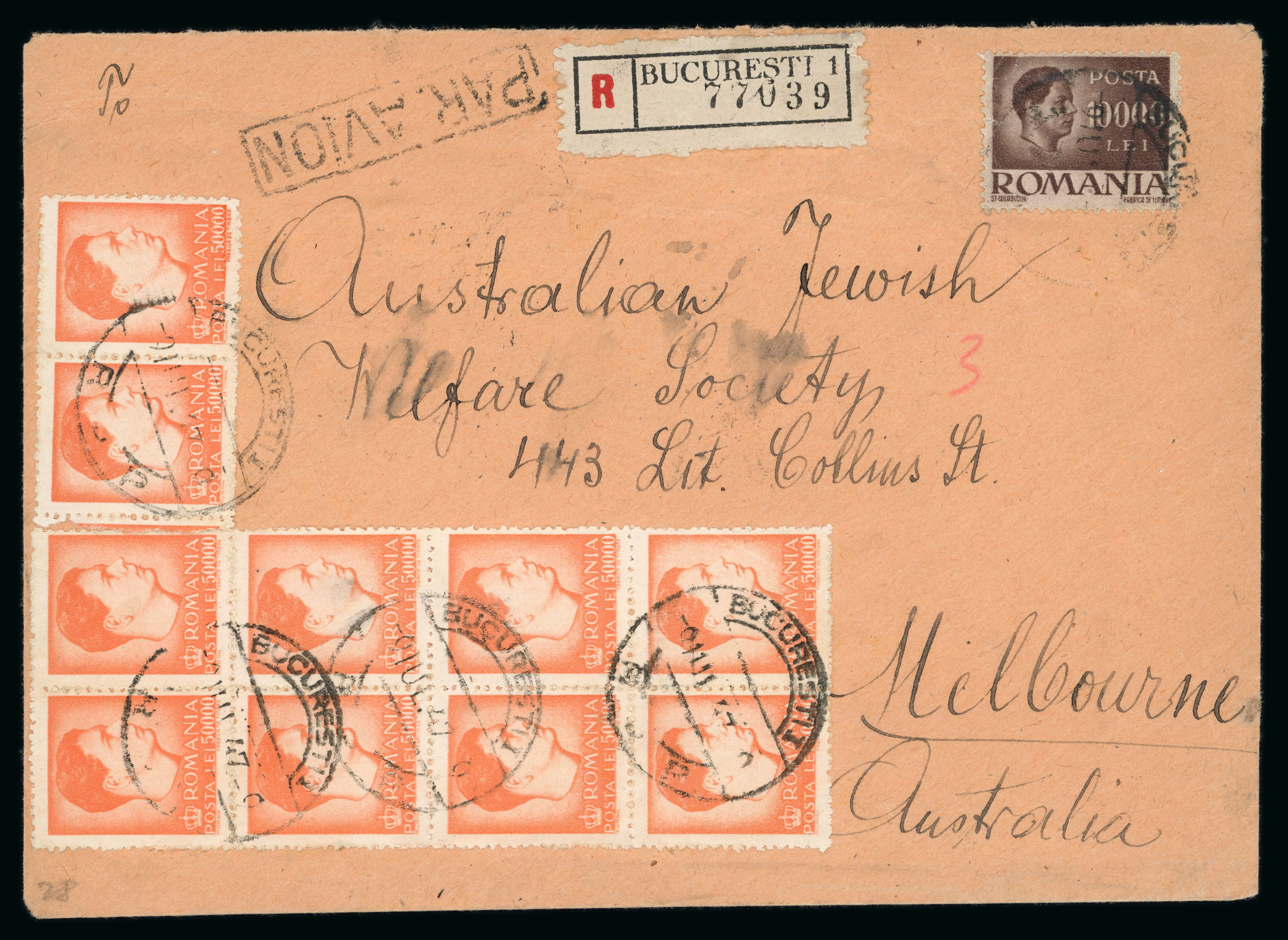 April to 30th June 1947 36,000 lei ordinary rates and 58,000 lei registered rates, registered airmail rates of 51,000 or 127,000 (for USA), July 1947 registered cover to Jewish Relief Association, Australia at 510,000 lei; fair to fine condition