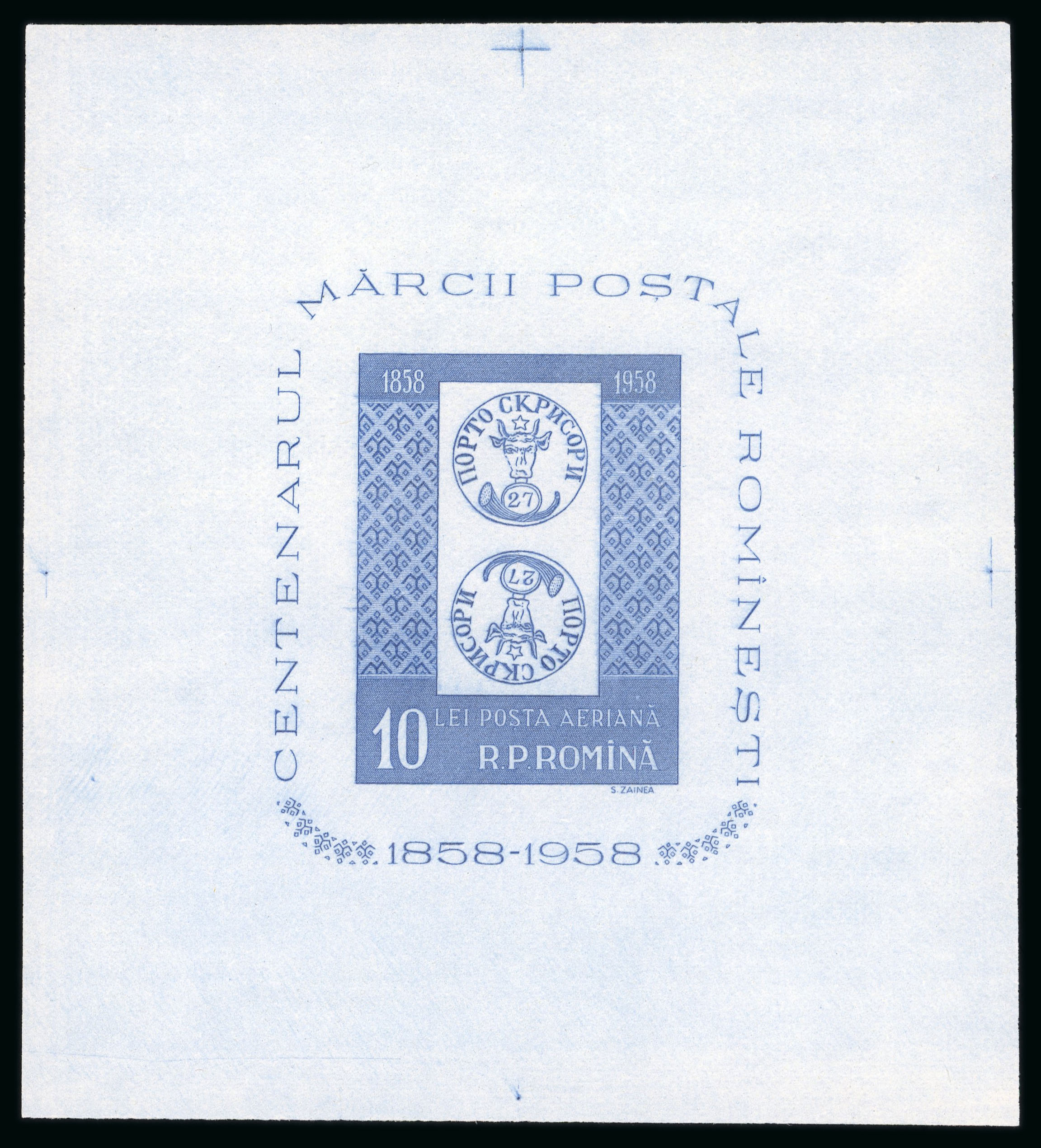 Patriotic Defence white paper set in corner marginals and brown paper set unused, 1946 Sports perforate and imperforate sheetlets, 1948 20l on 20l sheetlet, 1948 Chain Breaker colour proof on card, similar Russian Entry into Bucharest proof, 1949