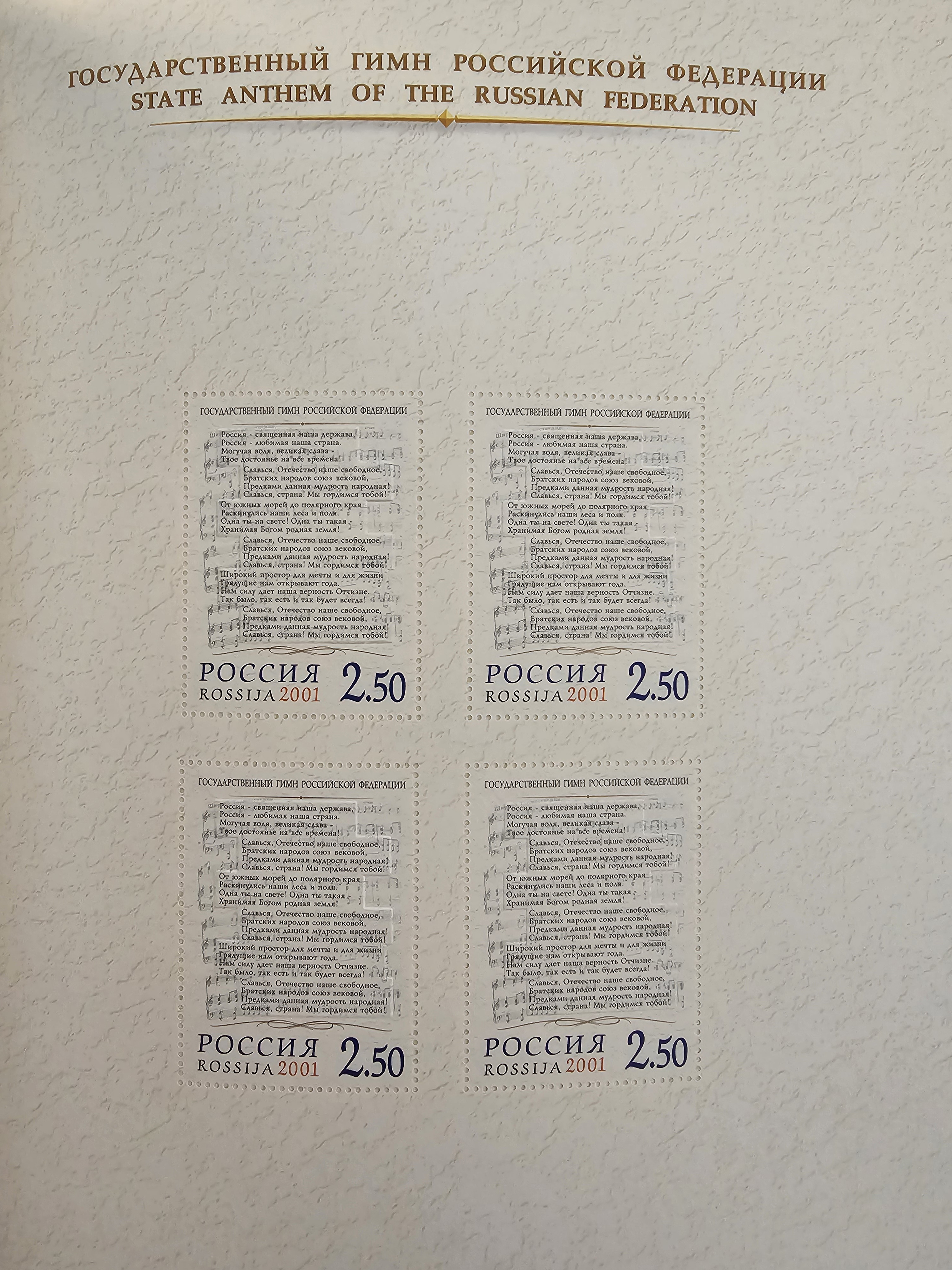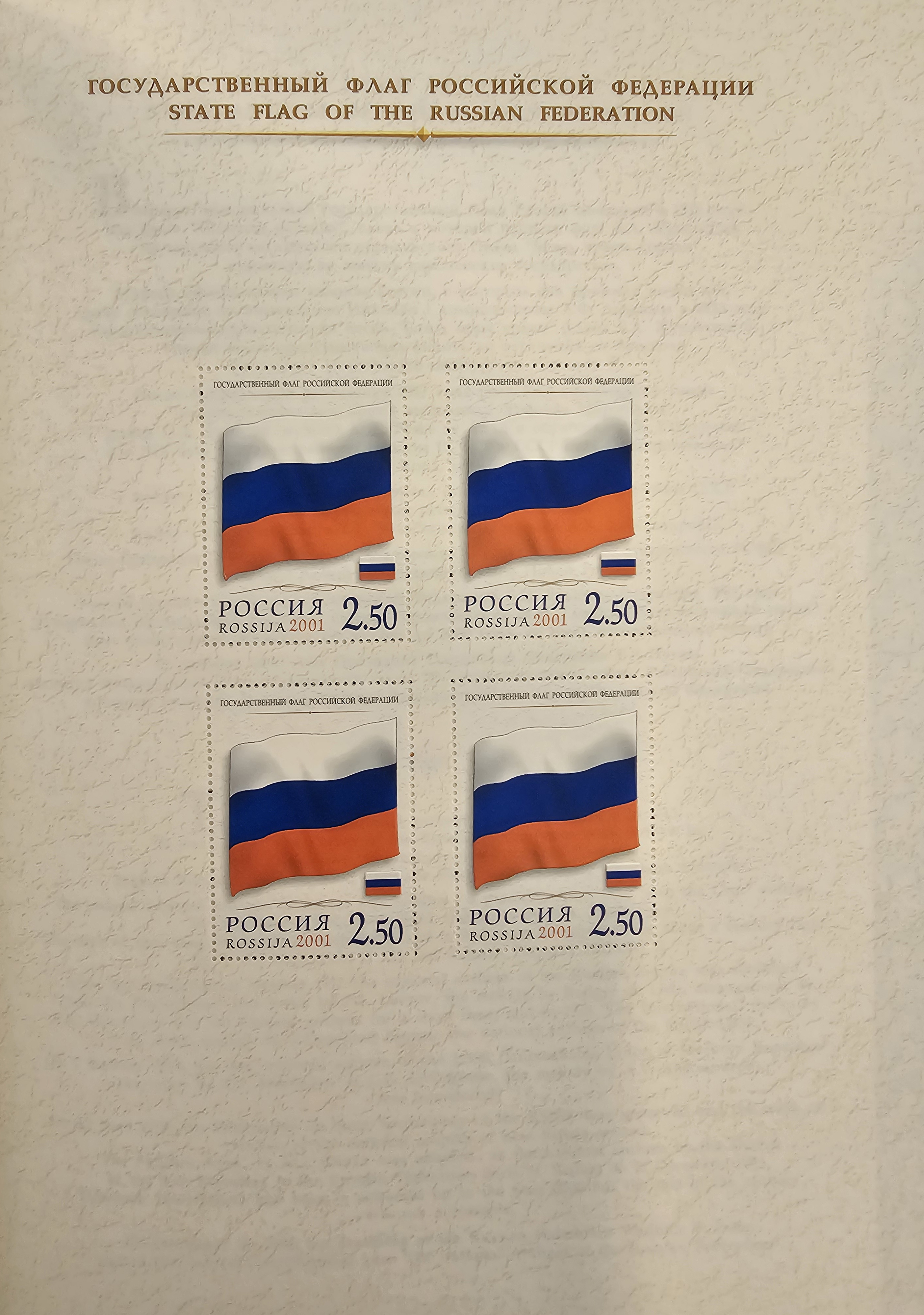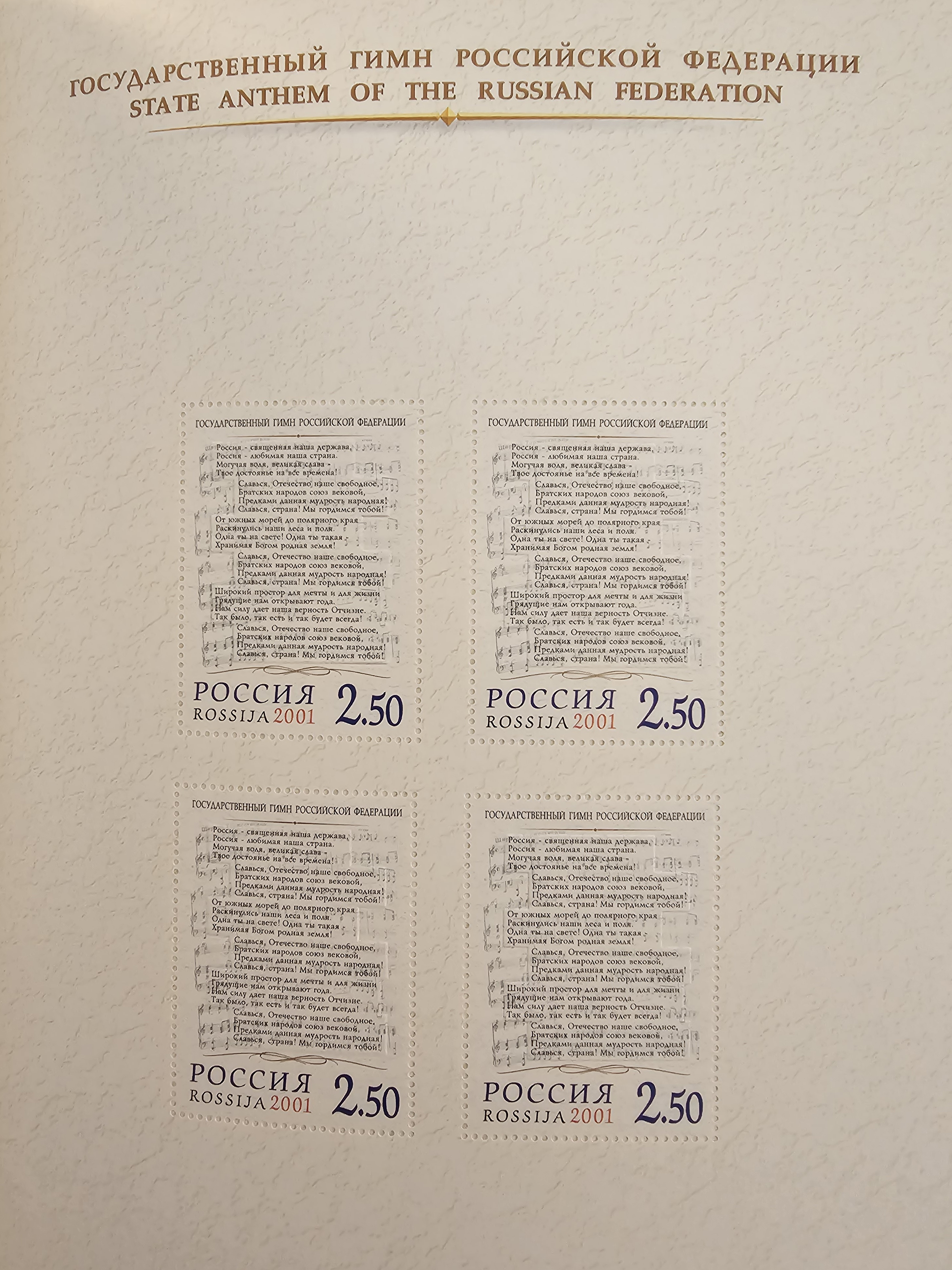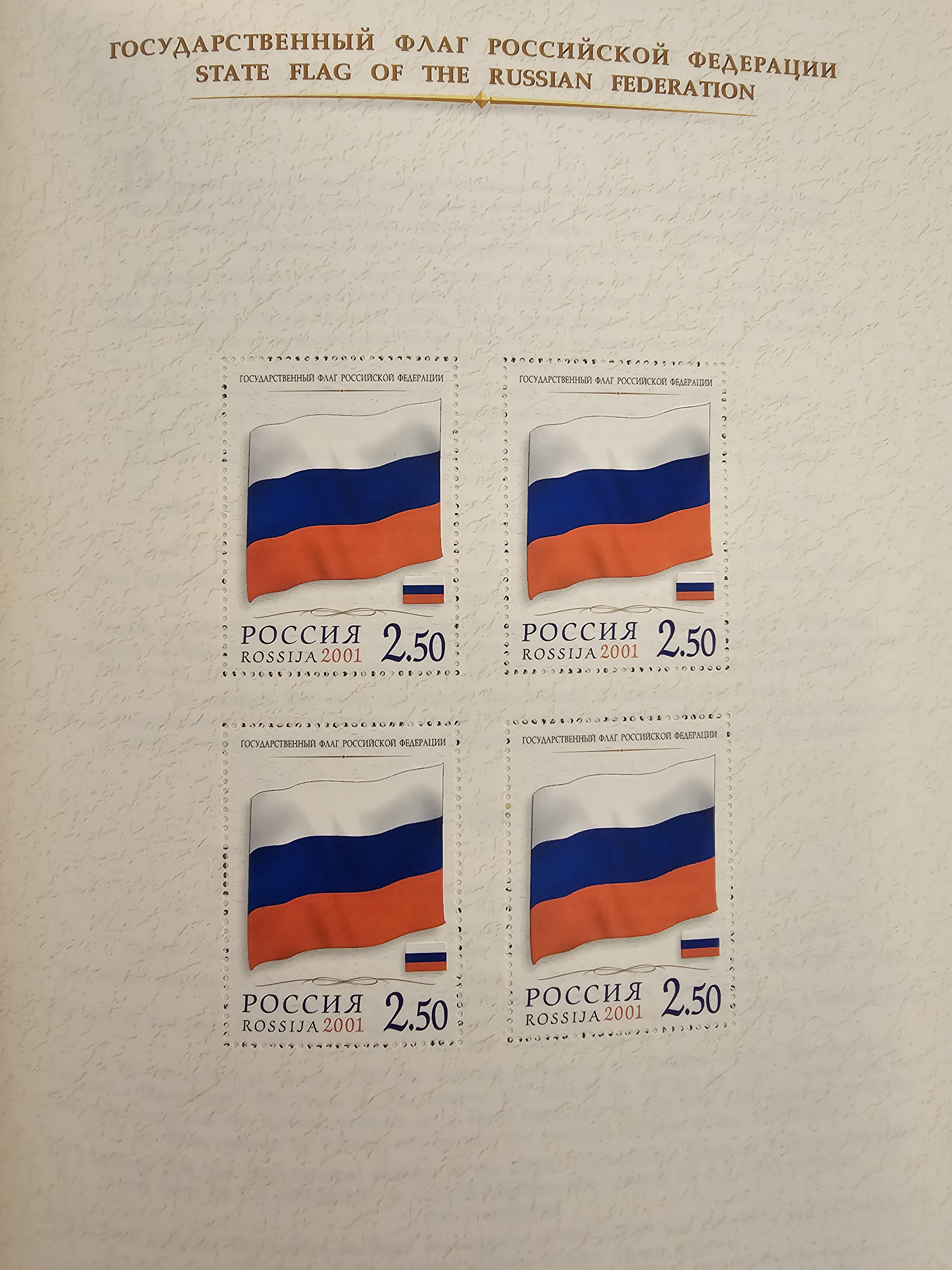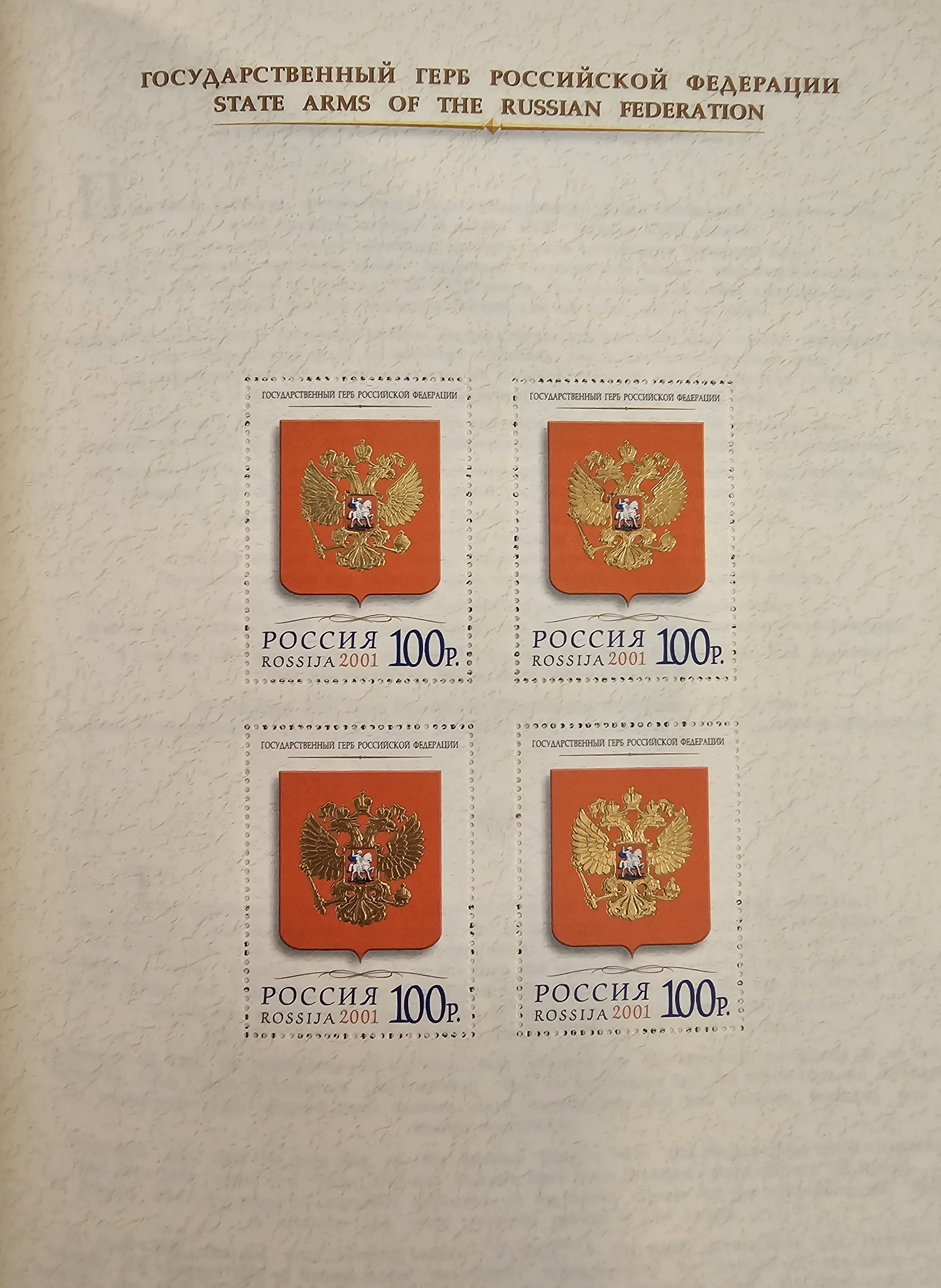 2001 State Arms, Flag and Anthem of the Russian Federation issues in three presentation booklets by Cartor (MH 6, with white, red or blue spines), with each showing the stamps printed in sheets of four plus the mini sheet which has a