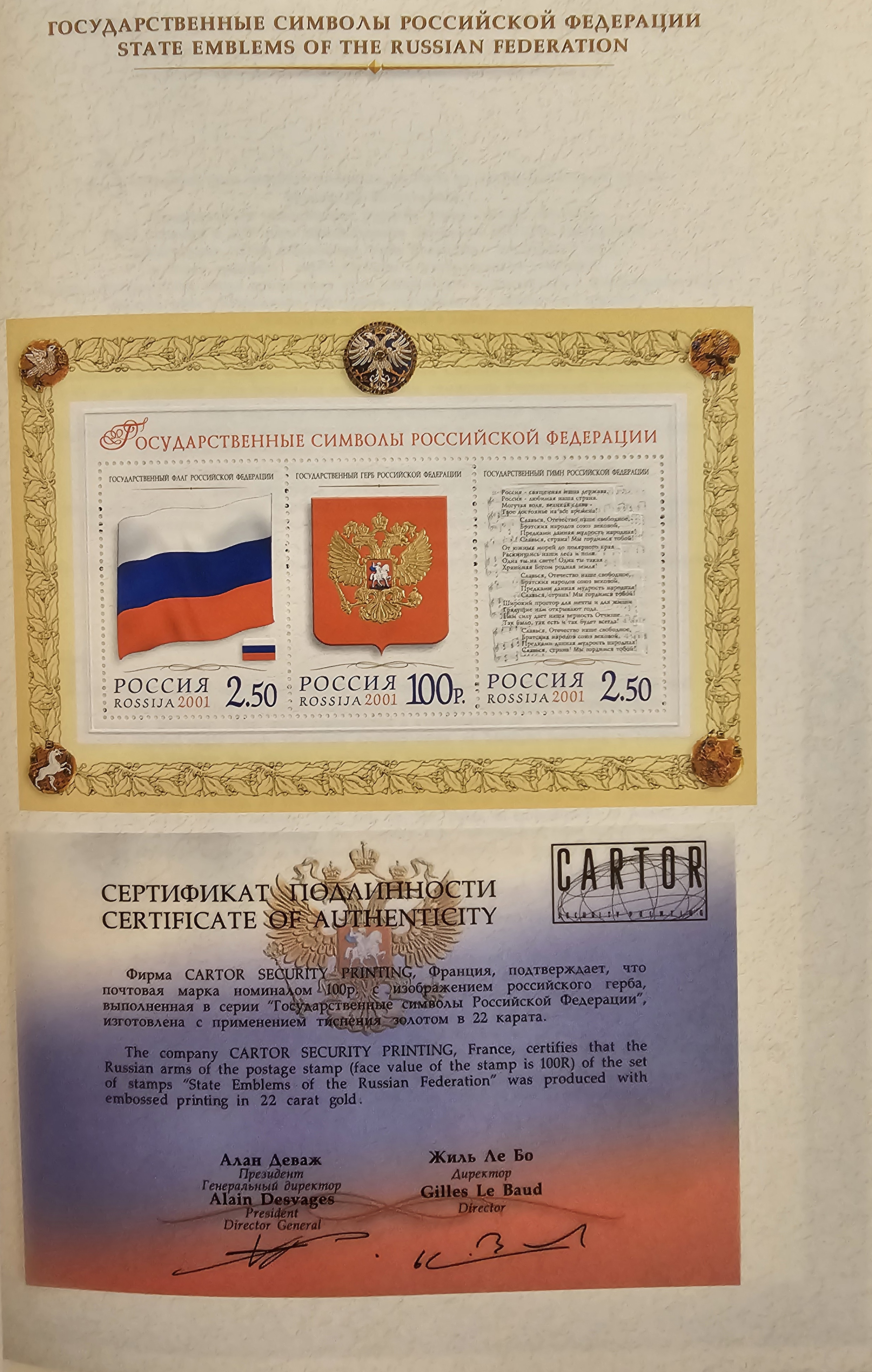 Cartor certificate of authenticity stating that the gold is 22 carat. Only very few sets were printed. A modern rarity of Russian Philately (Michel €750 for the standard booklet). (Image 1)