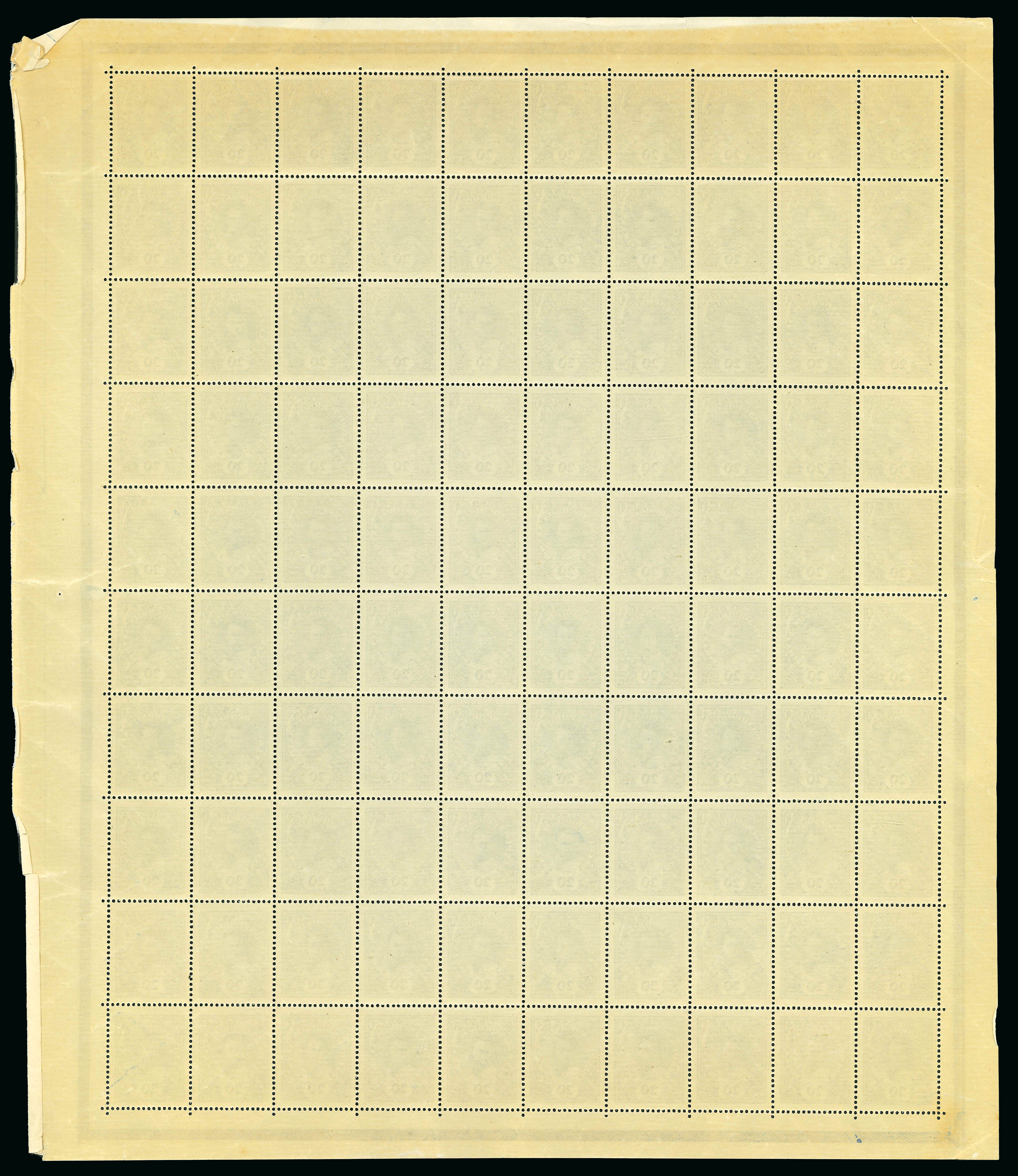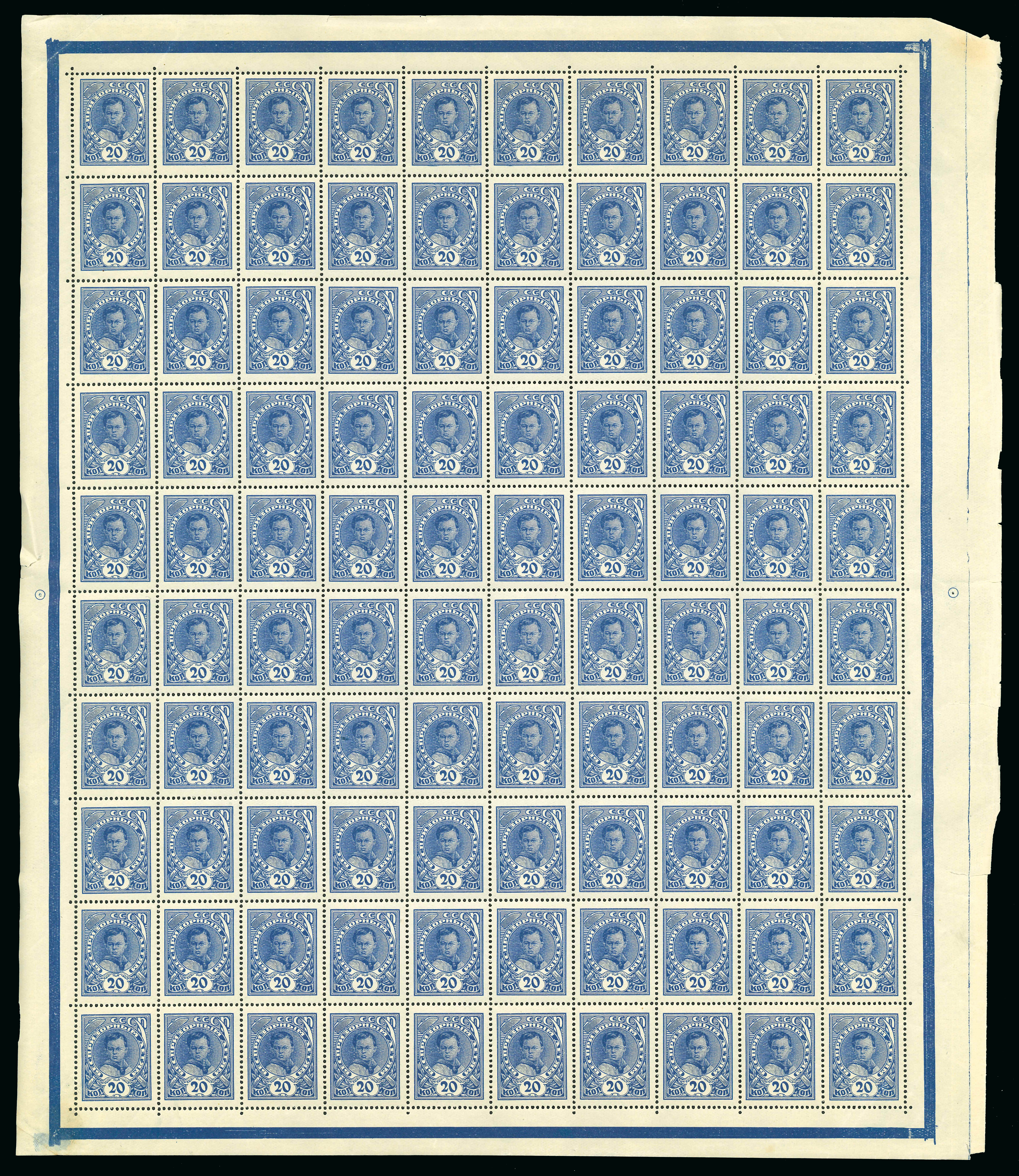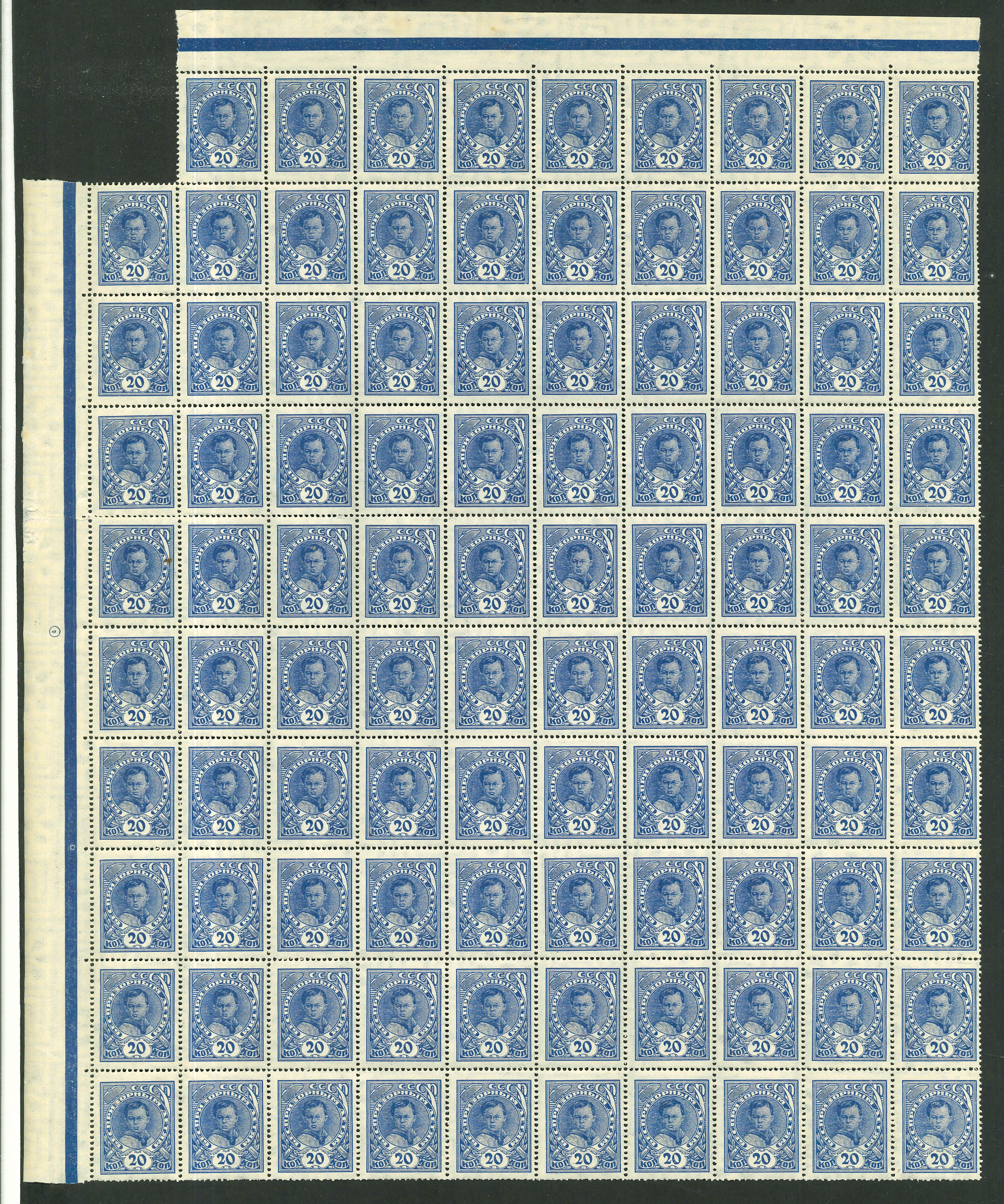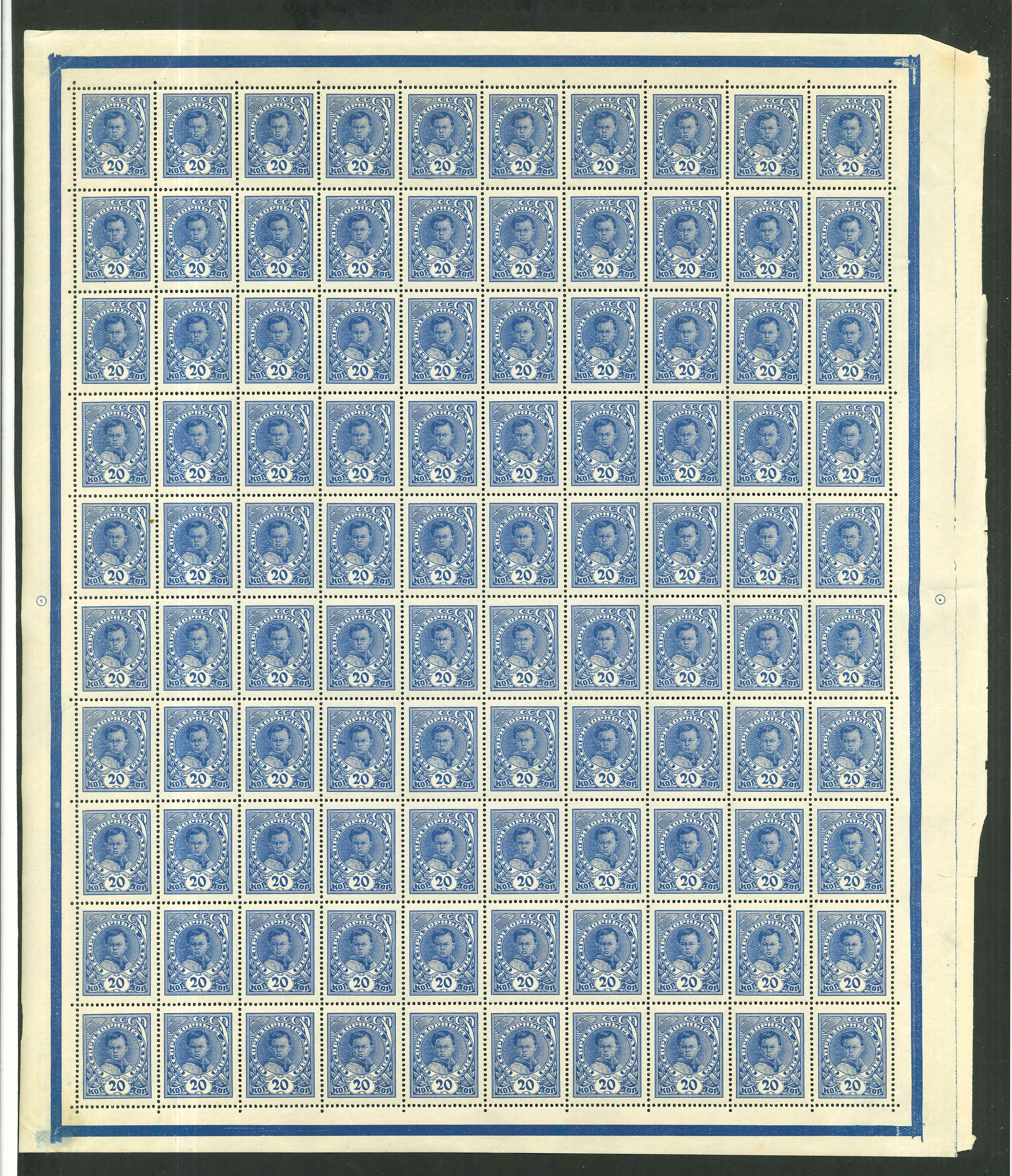 1908 20k with variety background printing missing in mint n.h. quarter sheet of 25 copies, very fine (Mi. €3'500). (Image 1)