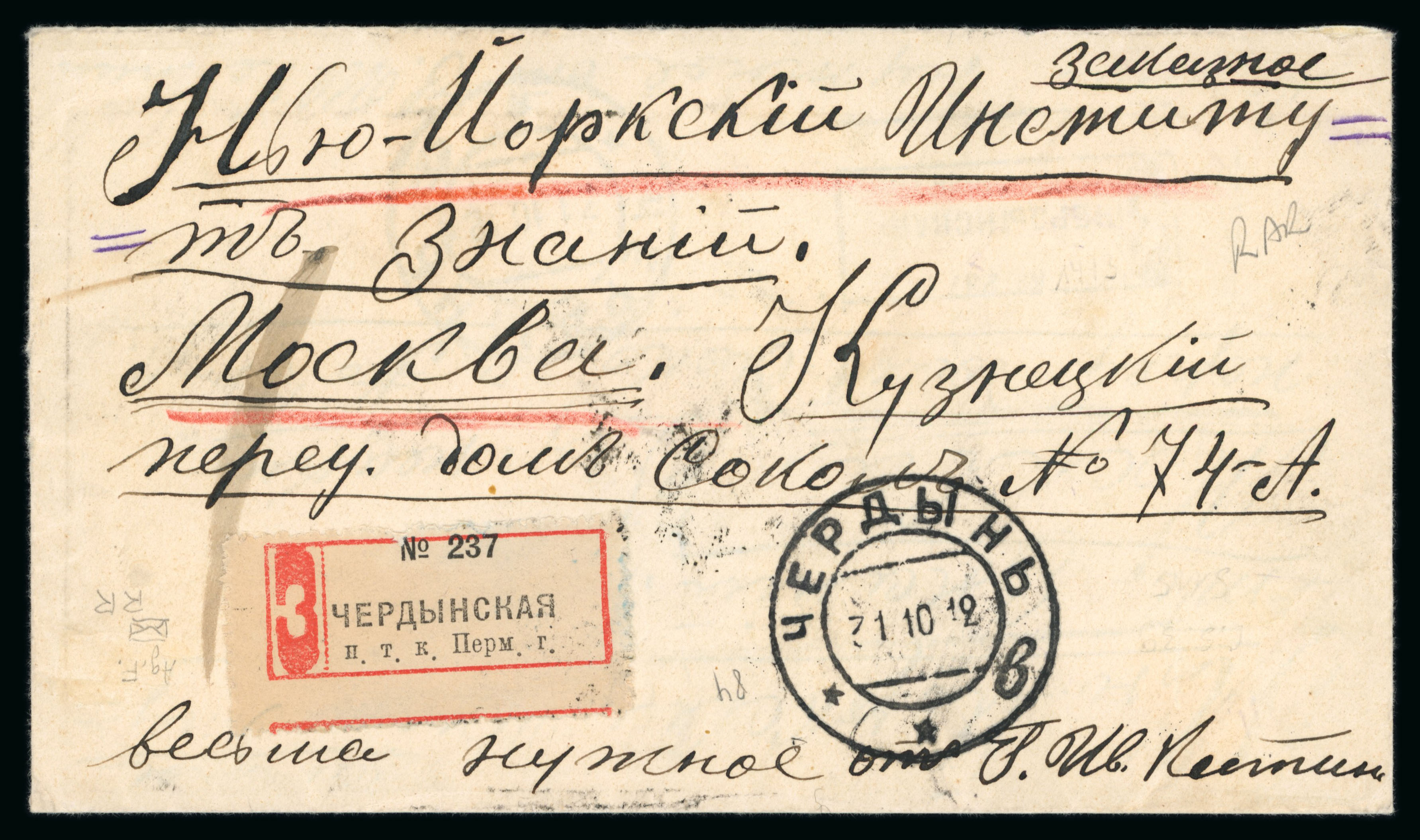 Cherdyn: 1912 registered cover to Moscow franked on reverse pair 'White Bear' 2 kopeks (Chuchin 32) tied straight-line violet TULPAN handstamps with pair of Imperial 7kop alongside. A rare cover, illustrated in Fabergé 1993 book on page