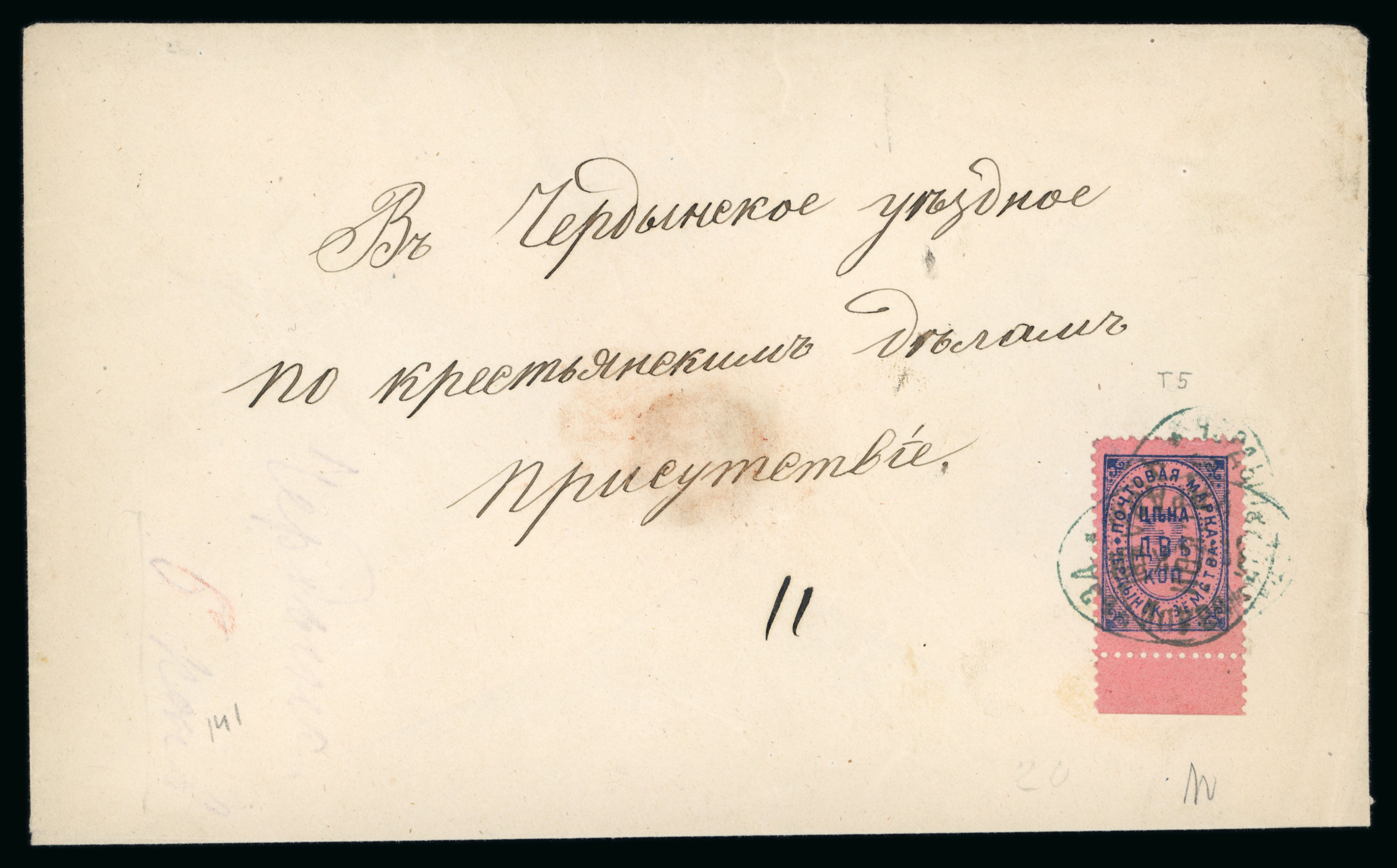 Cherdyn: 1890s undated local envelope franked 2 kopeks bottom marginal tied two green oval CHERDINSKOI UYESD.UPRAV date stamps, fine vibrant colours; cert. Kaj Hellman (2001); ex Hellman, Fabergé. (Image 1)