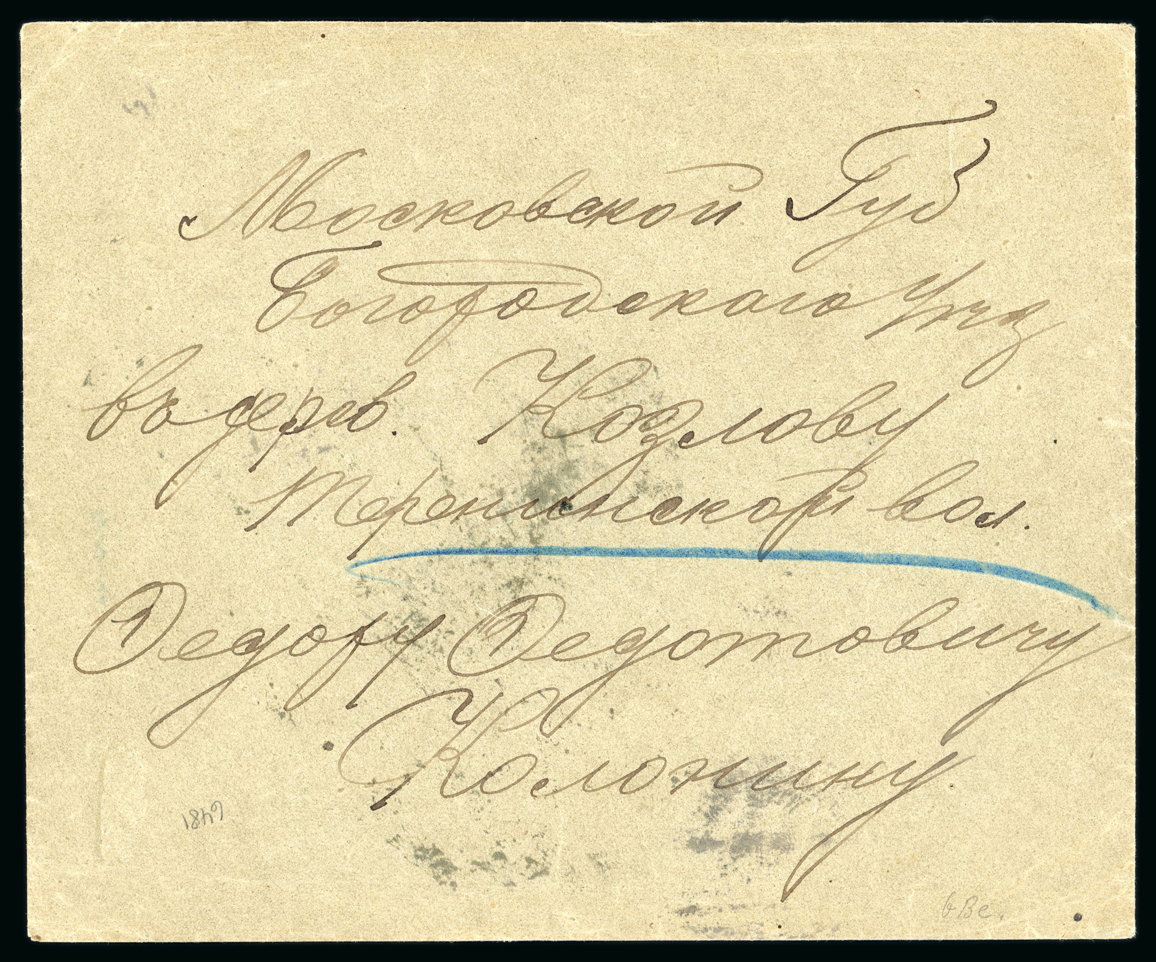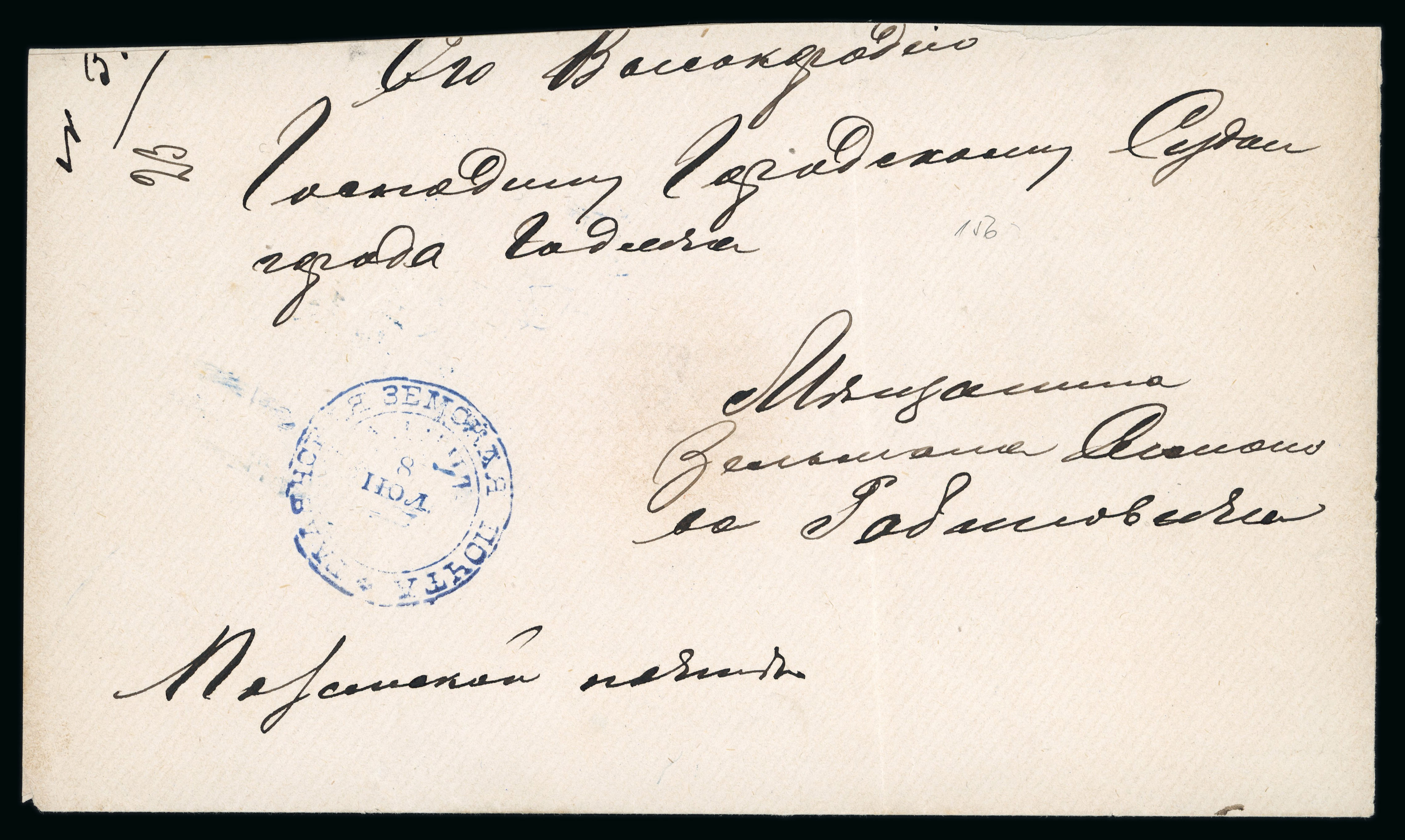 Irbit: 1884 (10 Apr) envelope bearing first issue 2 kopeks showing clear margins on three sides, touched at top, tied violet oval IRBITSKAYA ZEMSKAYA POTSTA date stamp, a rare number 1 on cover, small part backflap missing and light