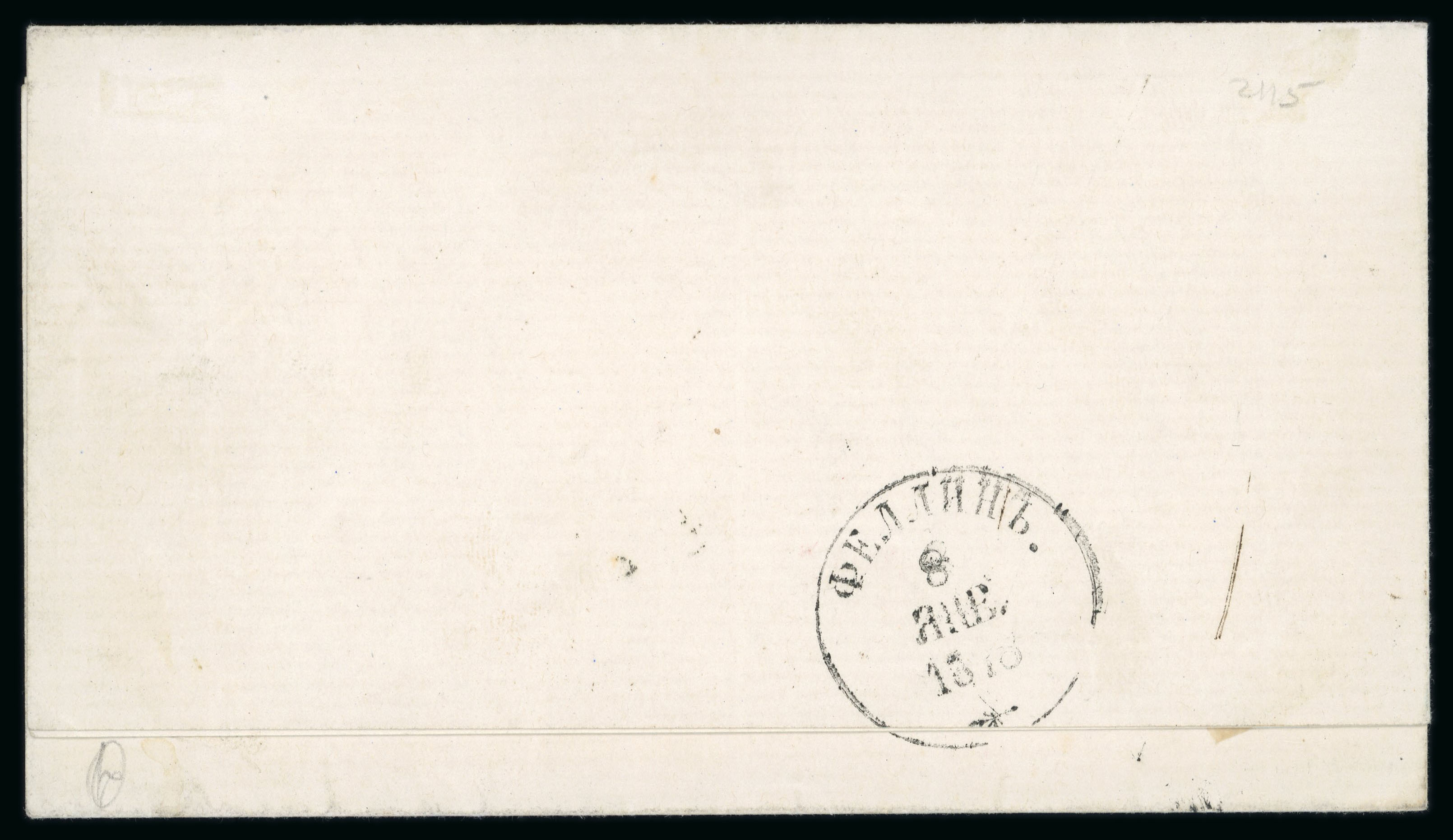 1875 registered cover from Odessa to Kamenels franked by vertical laid paper 1875 8k carmine and grey in horizontal strip of four tied by three neat, clear cds, further despatch and and arrival cancel on reverse. This strip is the largest