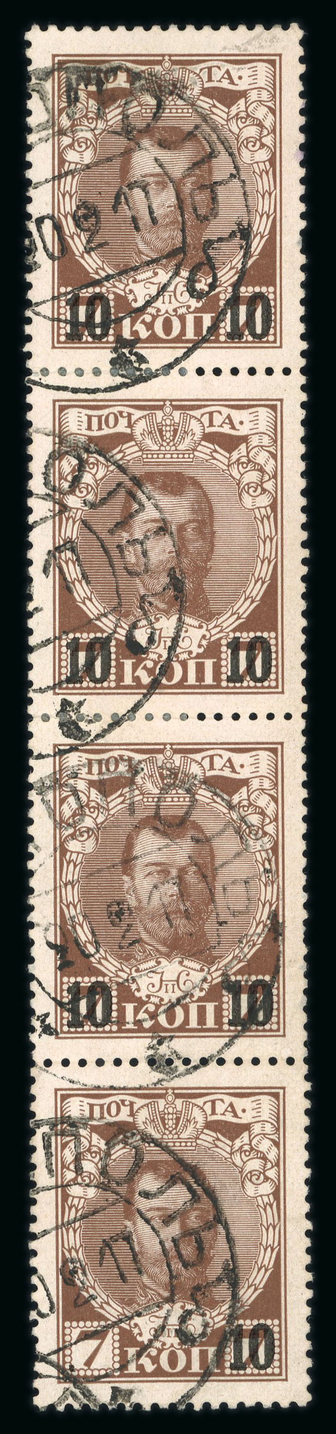 1916 10k. on 7k. brown in vertical strip of four, the bottom stamp with variety '10' missing from left side, some perf reinforcing, a most striking Romanov variety seldom encountered. (Image 1)