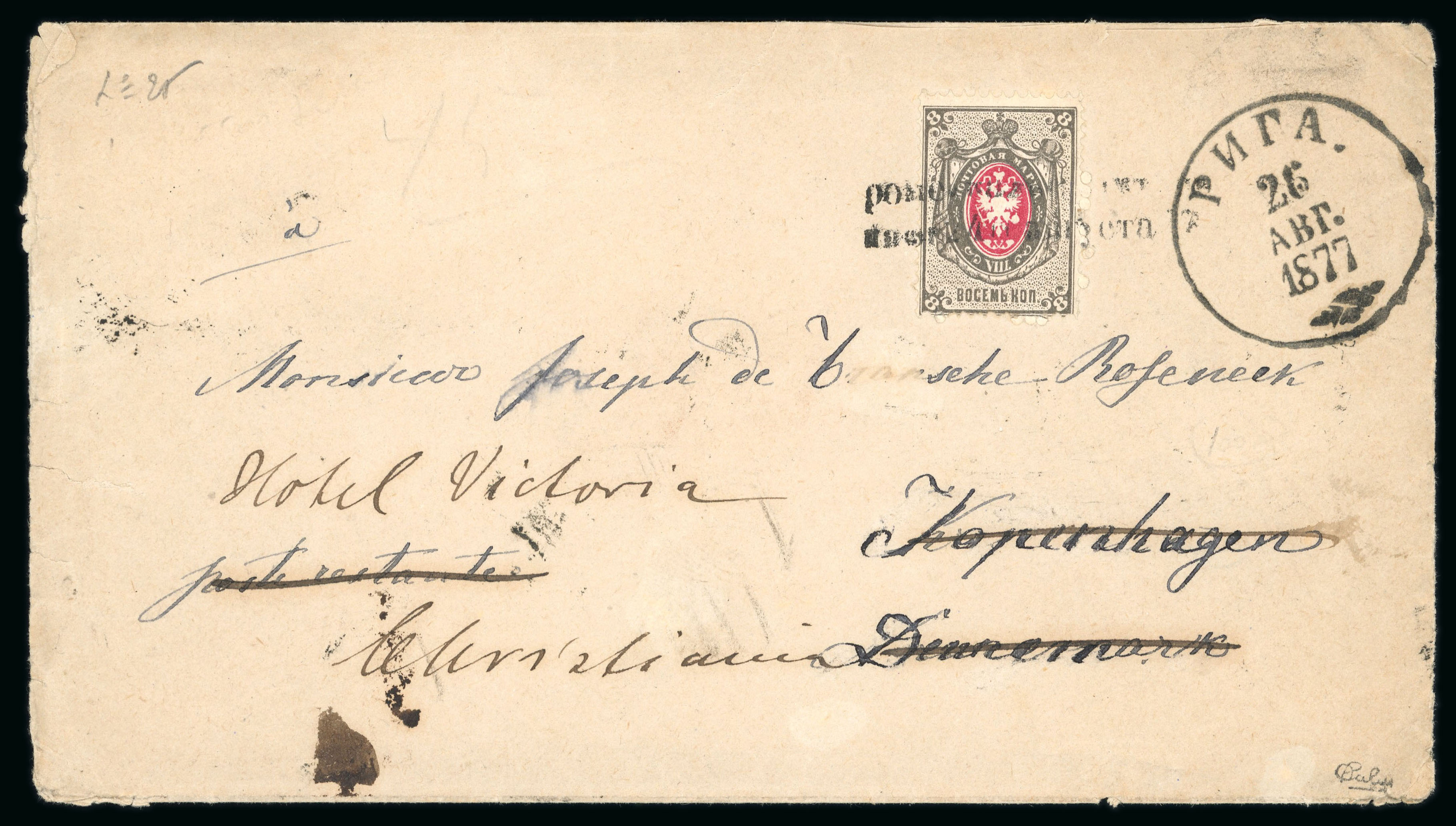 1877 envelope to poste restante, Copenhagen franked horizontally laid paper 8k carmine and grey tied by two-line date stamp. Riga cds alongside, redirected om arrival to Hotel Victoria Christiania, revers with further two-line despatch