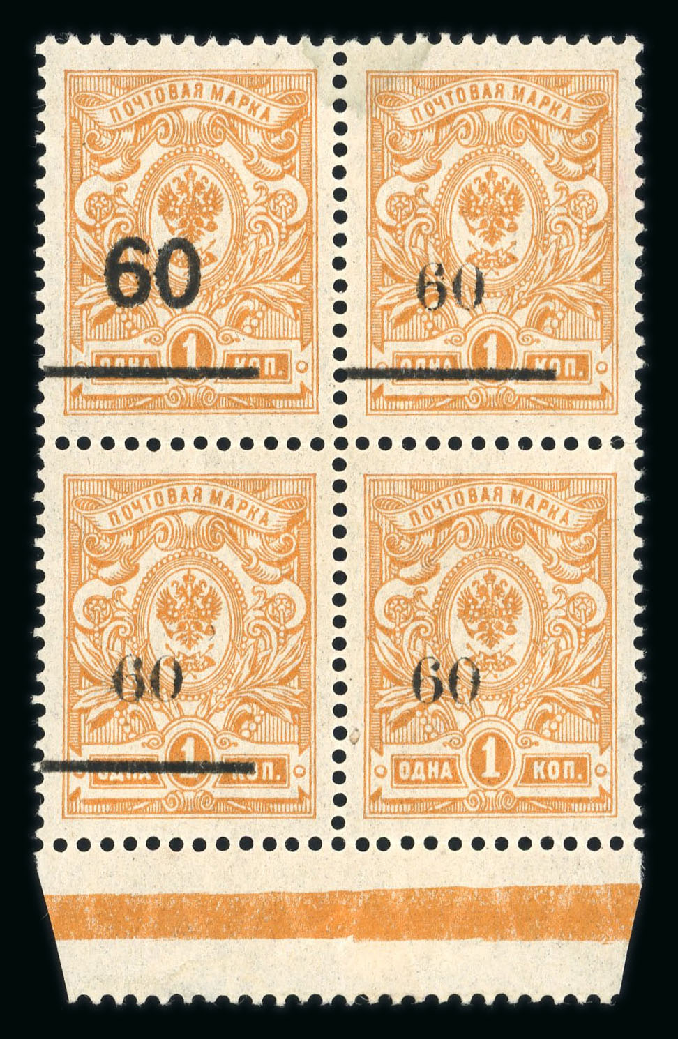 Sochi: 1918 60(k) on 1k perf bottom marginal block of four comprising types III and IV at top and IV and V at base, hinged in bottom margin only, each with Mikulski handstamp. A very rare multiple with only 24 examples of type V can exist