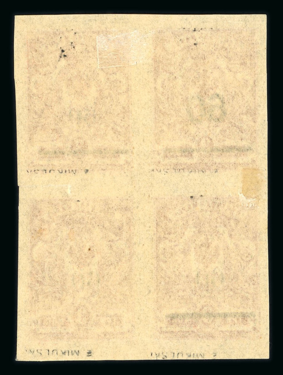 Sochi: 1918 60(k) on 3k imperf bottom marginal block of four comprising types III and IV at top and IV and V at base, hinged on top pair only, each with Mikulski handstamp. A very rare multiple with only 15 examples of type V can exist