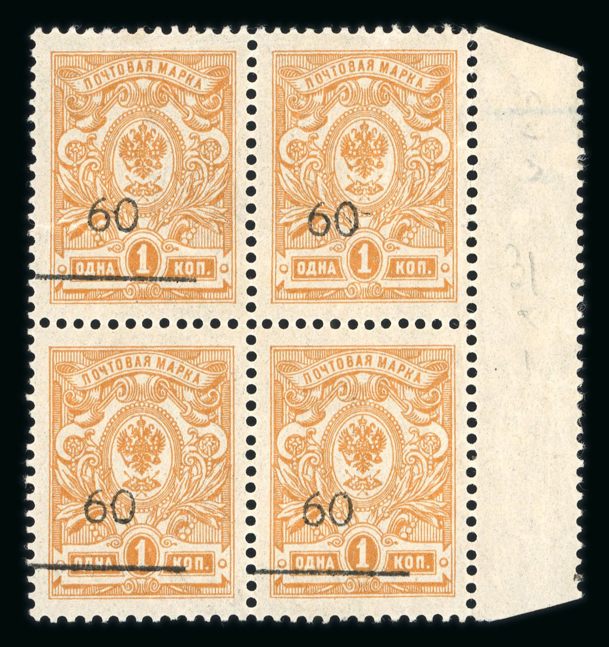 Sochi: 1918 60(k) on 1k perf right-hand marginal block of four comprising types VI and VII at top and VI and VI at base, fine mint never hinged, each with Mikulski handstamp. A very rare multiple with only 8 examples of type VII can