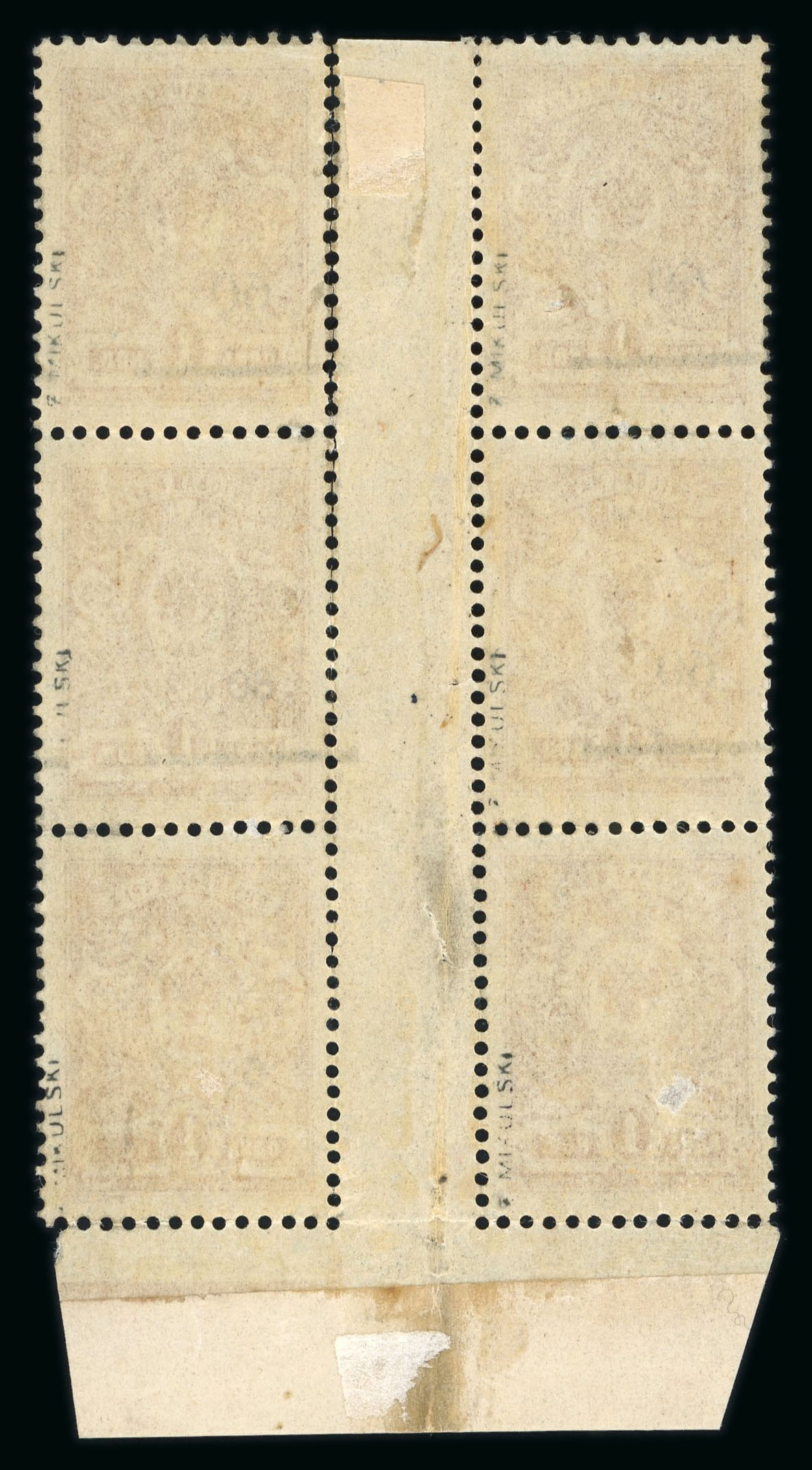 Sochi: 1918 60(k) on 1k perforated gutter block of six (2 x 3) with types VIII and VIII/ VIII and IX/ XI and XI, hinged in margins only, some perf splitting down top two stamps at right side, only 8 such blocks are possible; each with