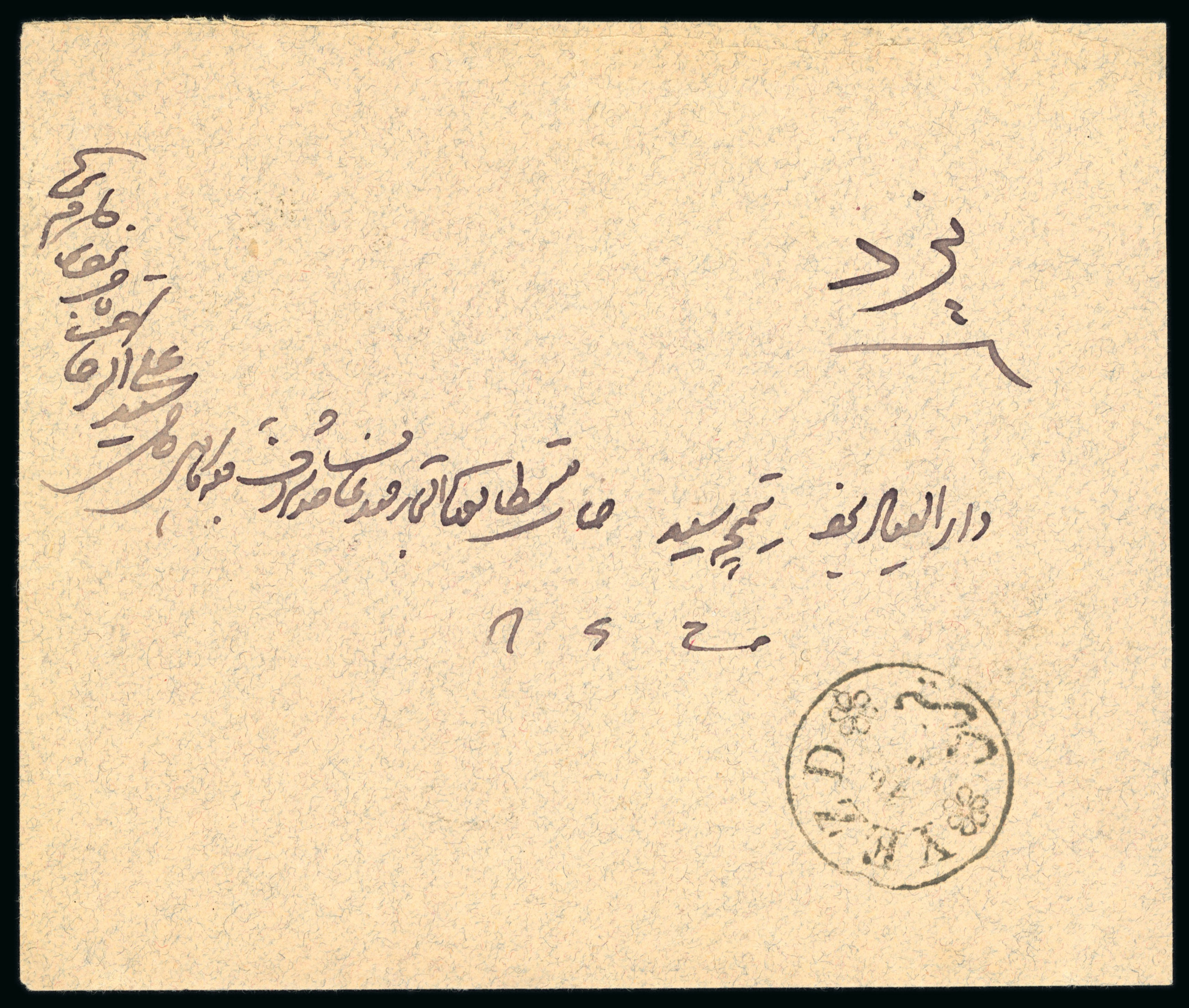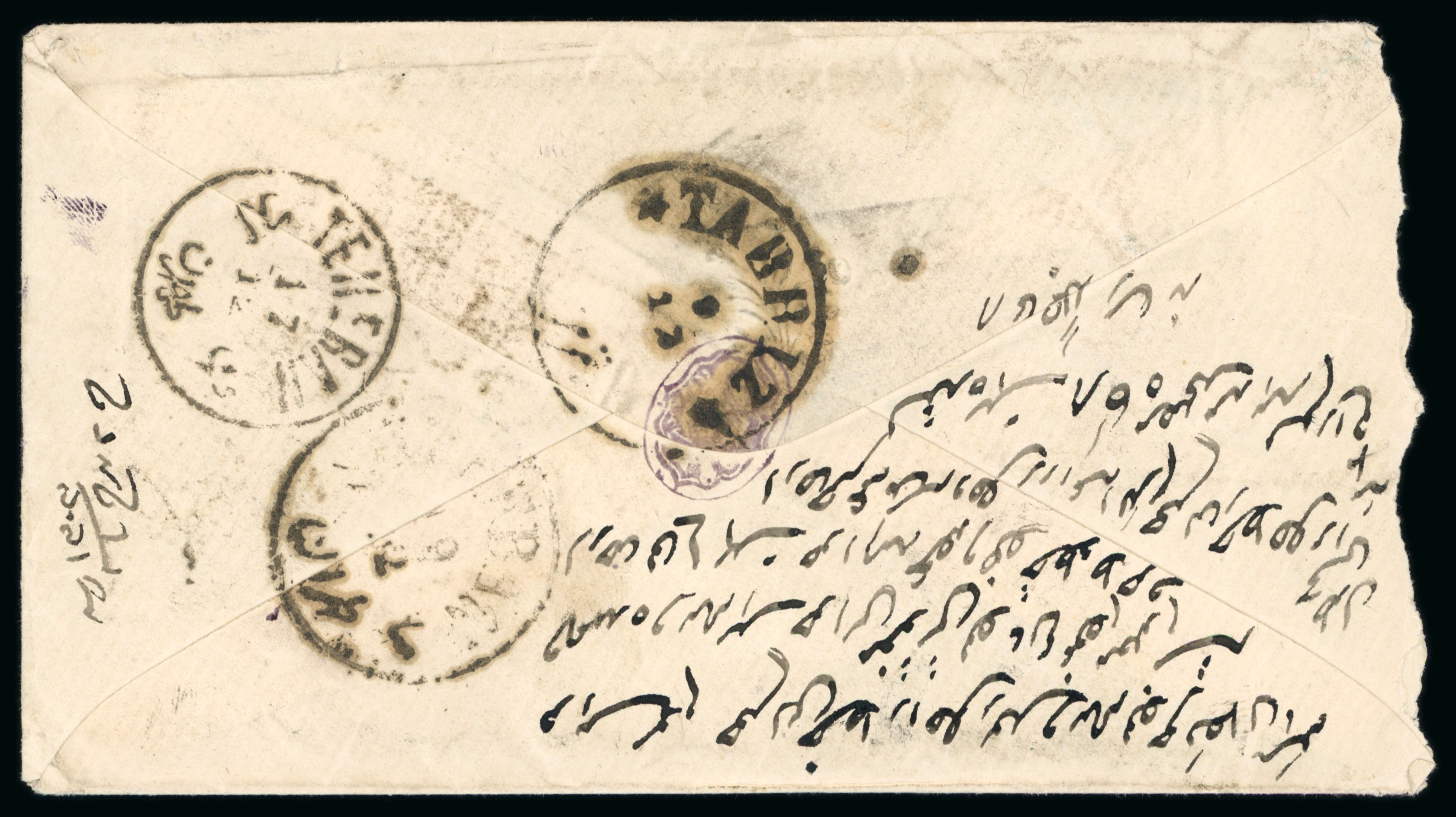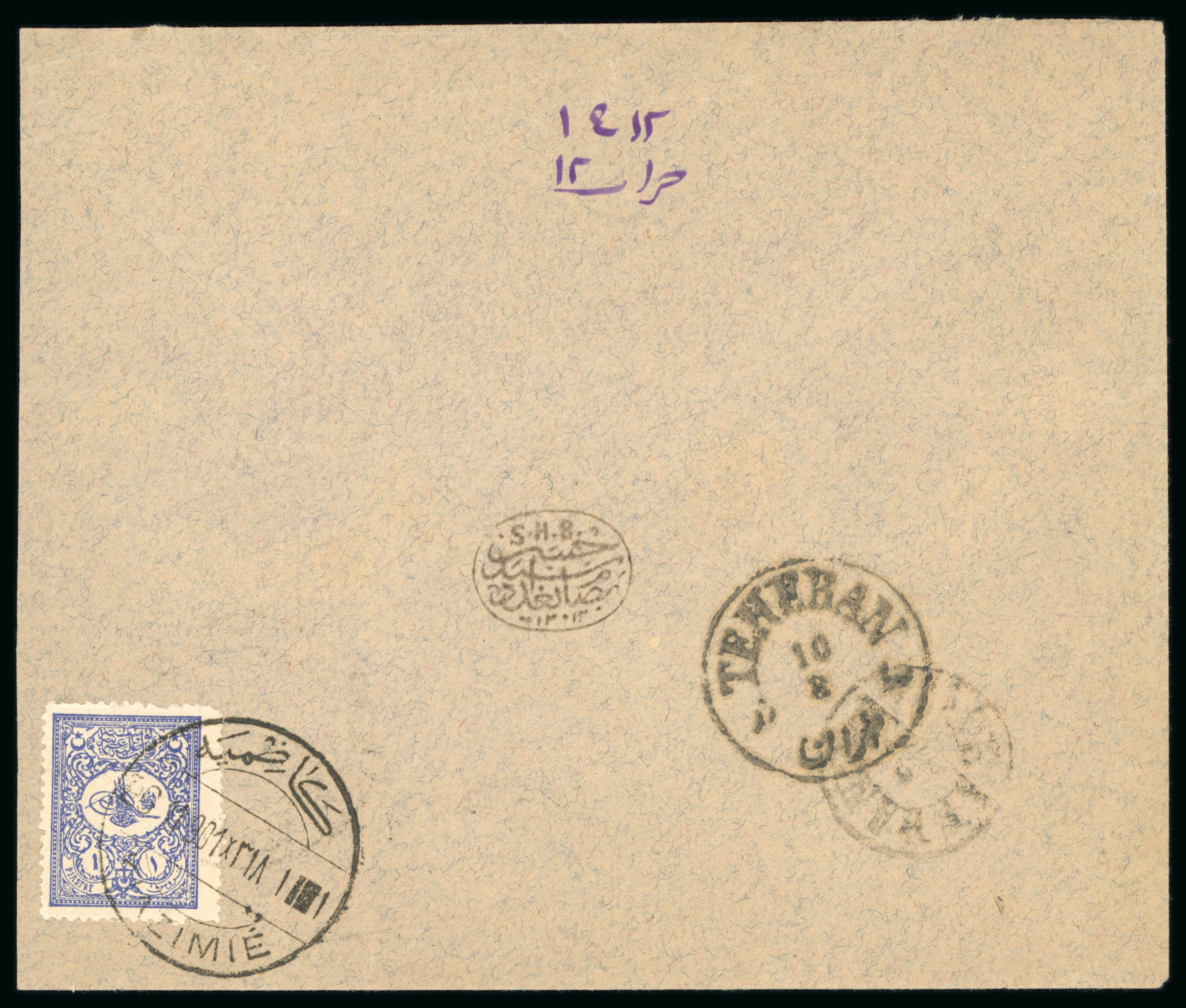 Ottoman Iraq group of items from Kerbela to Persia with 1890s envelope franked on reverse with 1pi black on grey-blue tied by framed negative handstamp (maybe) of Kerbela, 1892 issue 1pi grey-blue cover with contents to Ispahan tied