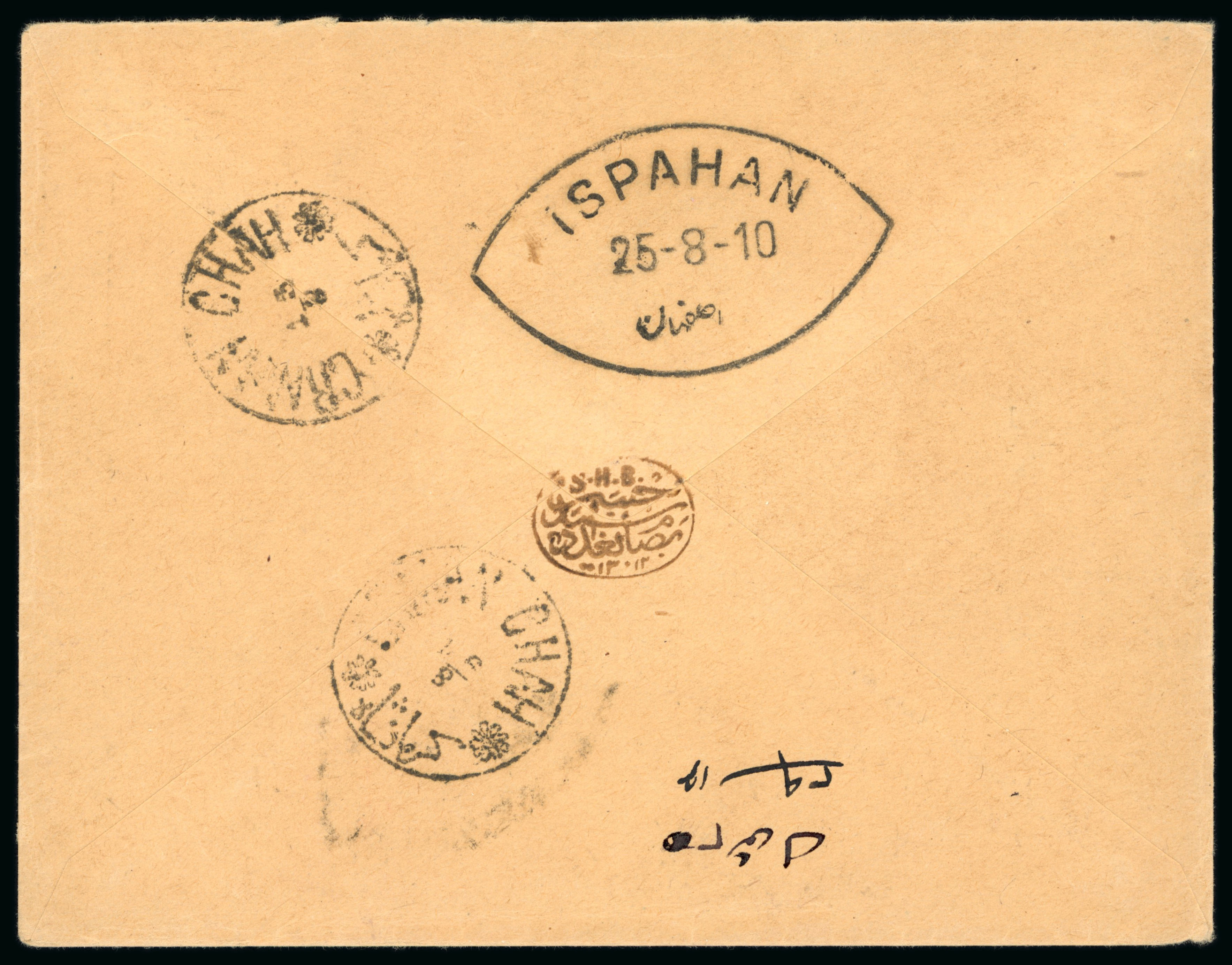 Ottoman Iraq three 1910 envelope to Ispahan or Yezd, Persia each bearing single franking 1pi and tied single ring blue, black or purple Kerbela despatch date stamps, good array of Persian transits, slight tears on blue cds cover, a good