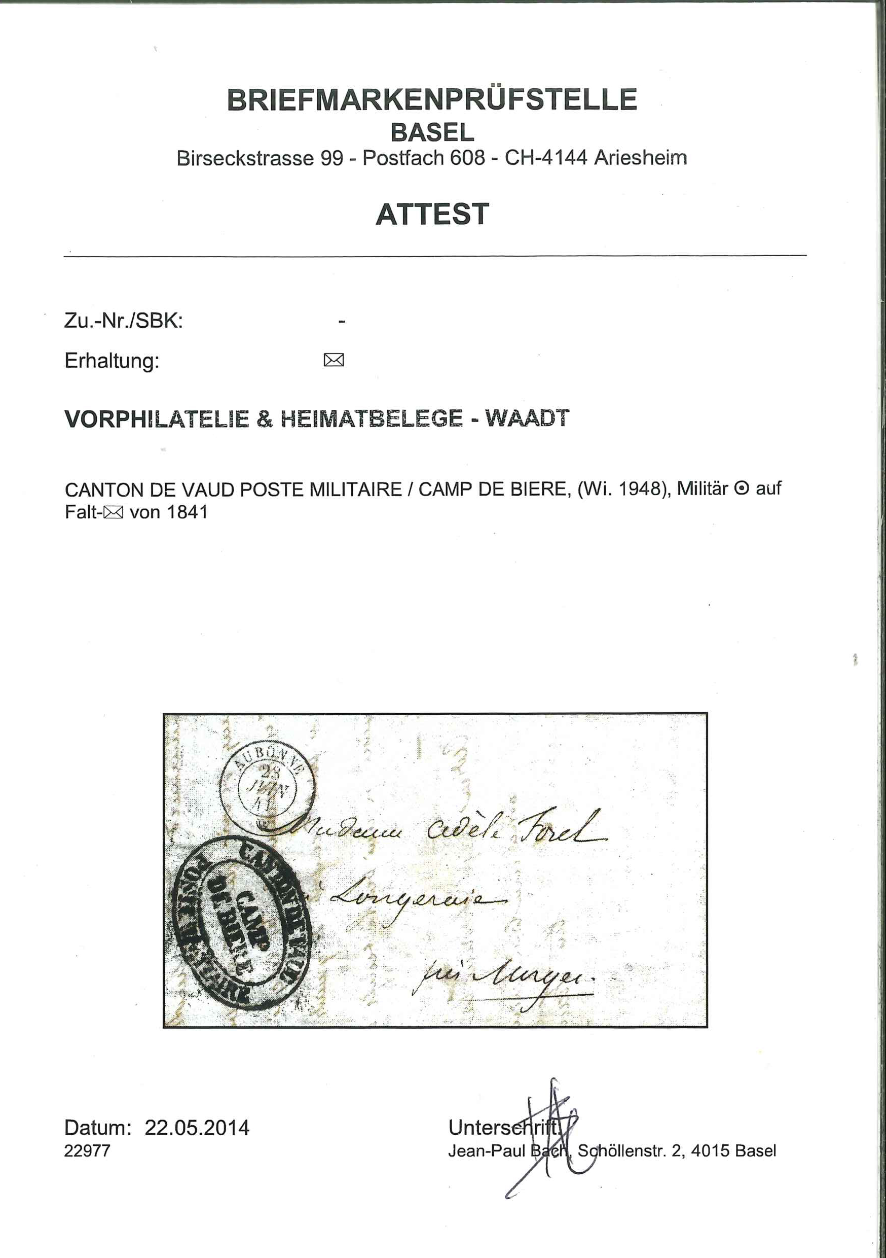 1841, Brief aus dem Camp de Bière nach Longerie près Morges, portofrei verwendet, mit Militärstempel « CANTON DE VAUD CAMP DE BIERE POSTE MILITAIRE » und zusätzlich Zweikreisstempel « AUBONNE 23 JUIN 41 », rückseitig Ankunftsstempel vom