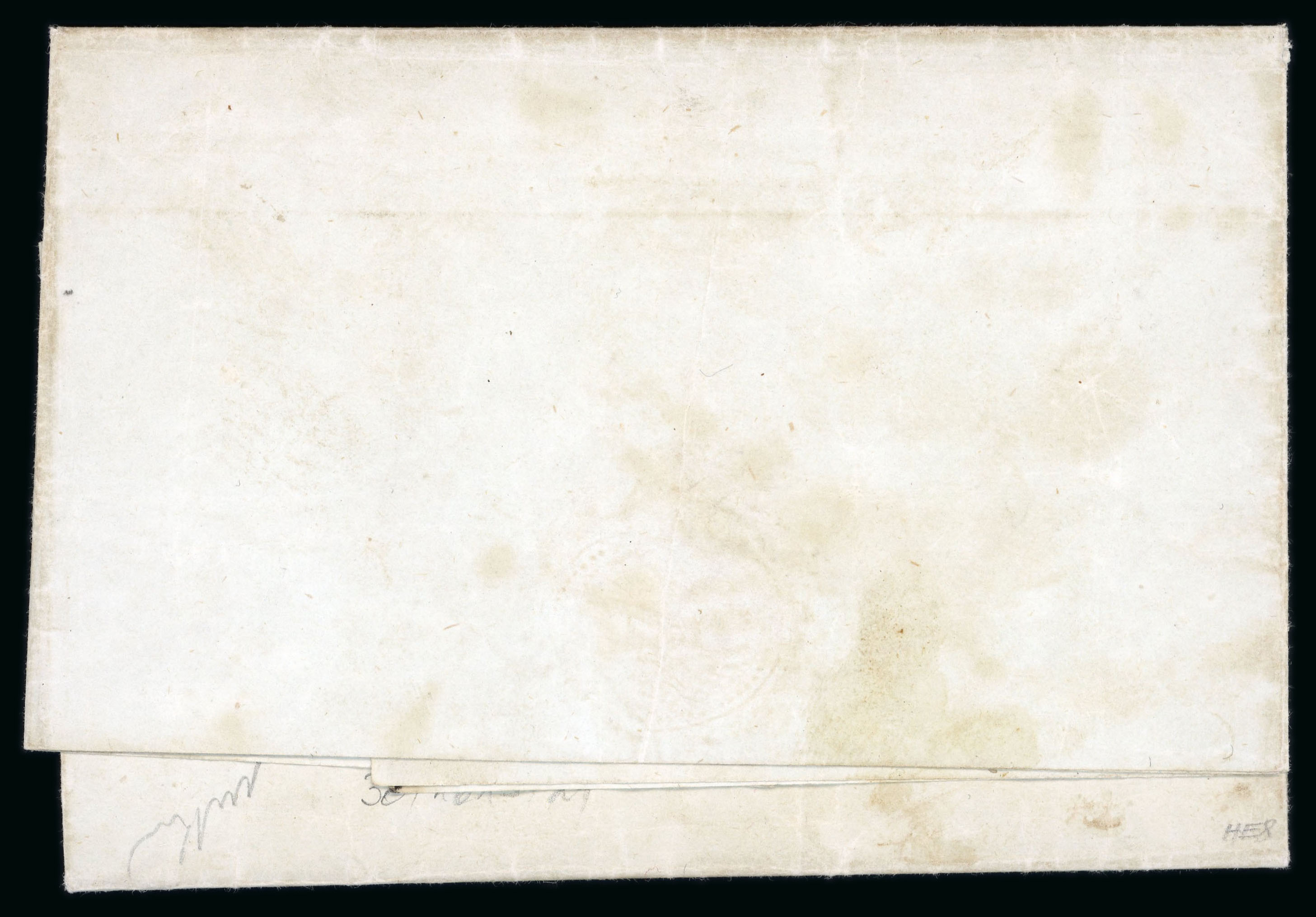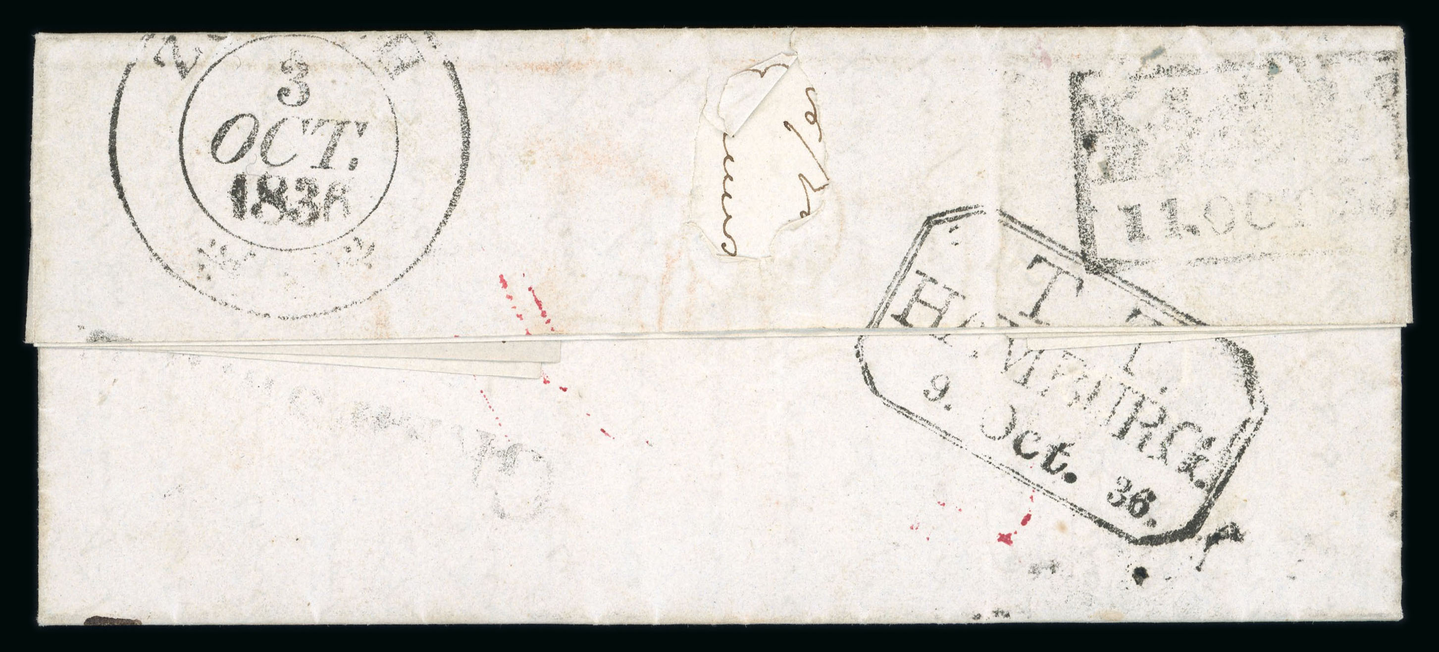 1836, Faltbrief von Zürich an den Schwedischen Baron Gustaf Ugglas in Stockholm (Schweden) über Hamburg, Greifswald (Pommern), Ystad, vorderseitig schwarzer Stempel « ZÜRICH 3 OCT. 36 », sowie schwarzer « AUSLAG VON ZÜRICH », rückseitig