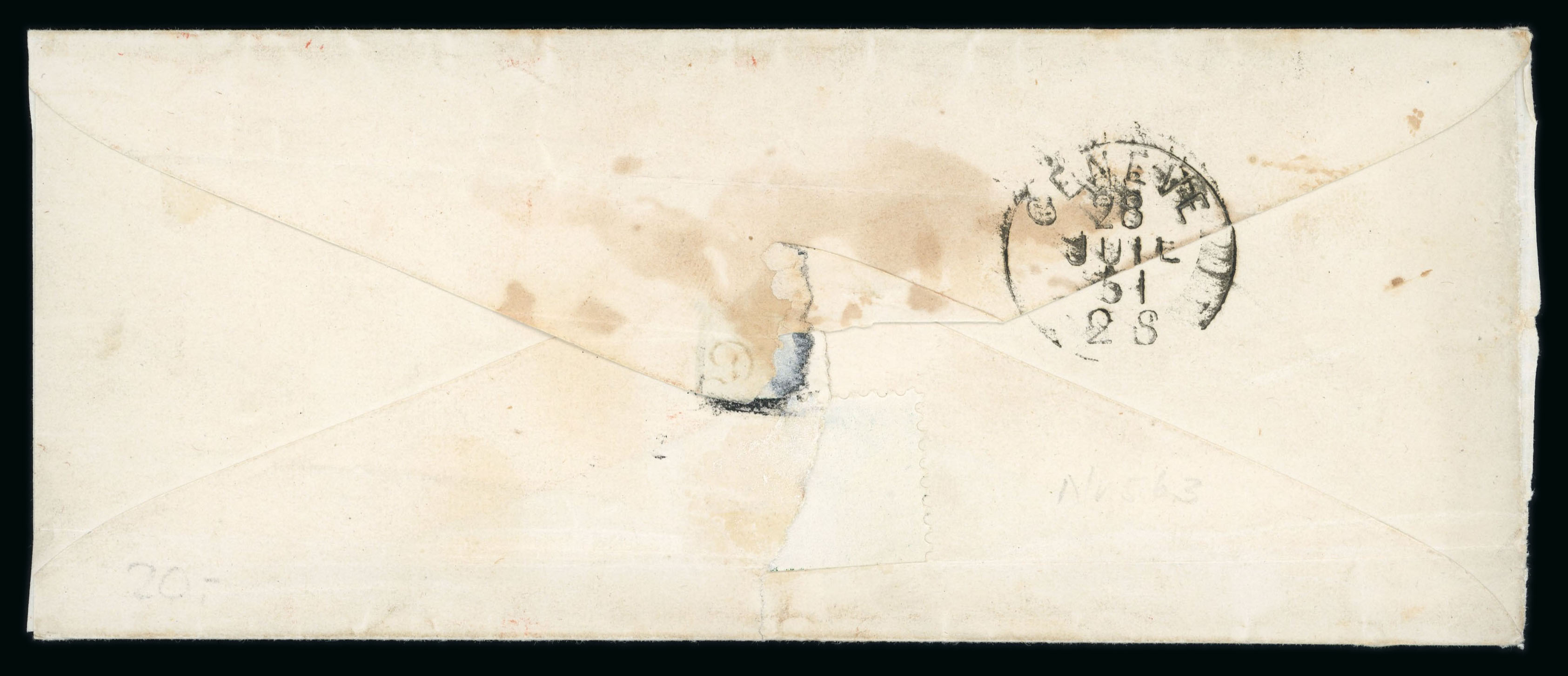 1851, Brief von Bex (Kanton Waadt) nach Lancy (Kanton Genf), in der Waadt mit 4 Kreuzer taxiert, welche in Genf durch 15 Cts. ersetzt wurden, Zweikreisstempel « BEX 28 JUIL 51 ». (Image 1)