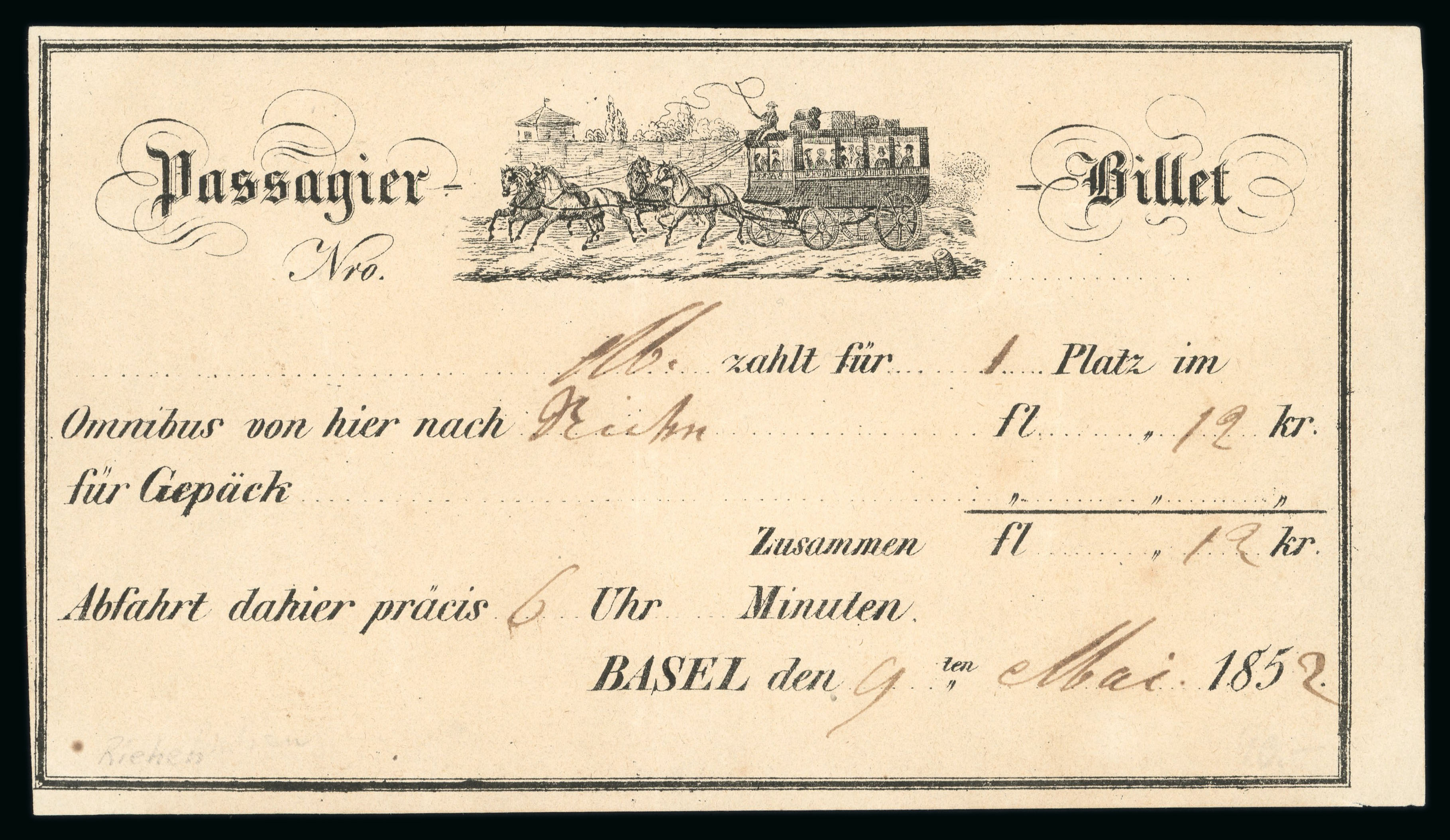 1852, Passagier Billet für einen Platz im Pferdeomnibus von Basel nach Riehen. Die Gebühr war 12 Kreuzer. (Image 1)