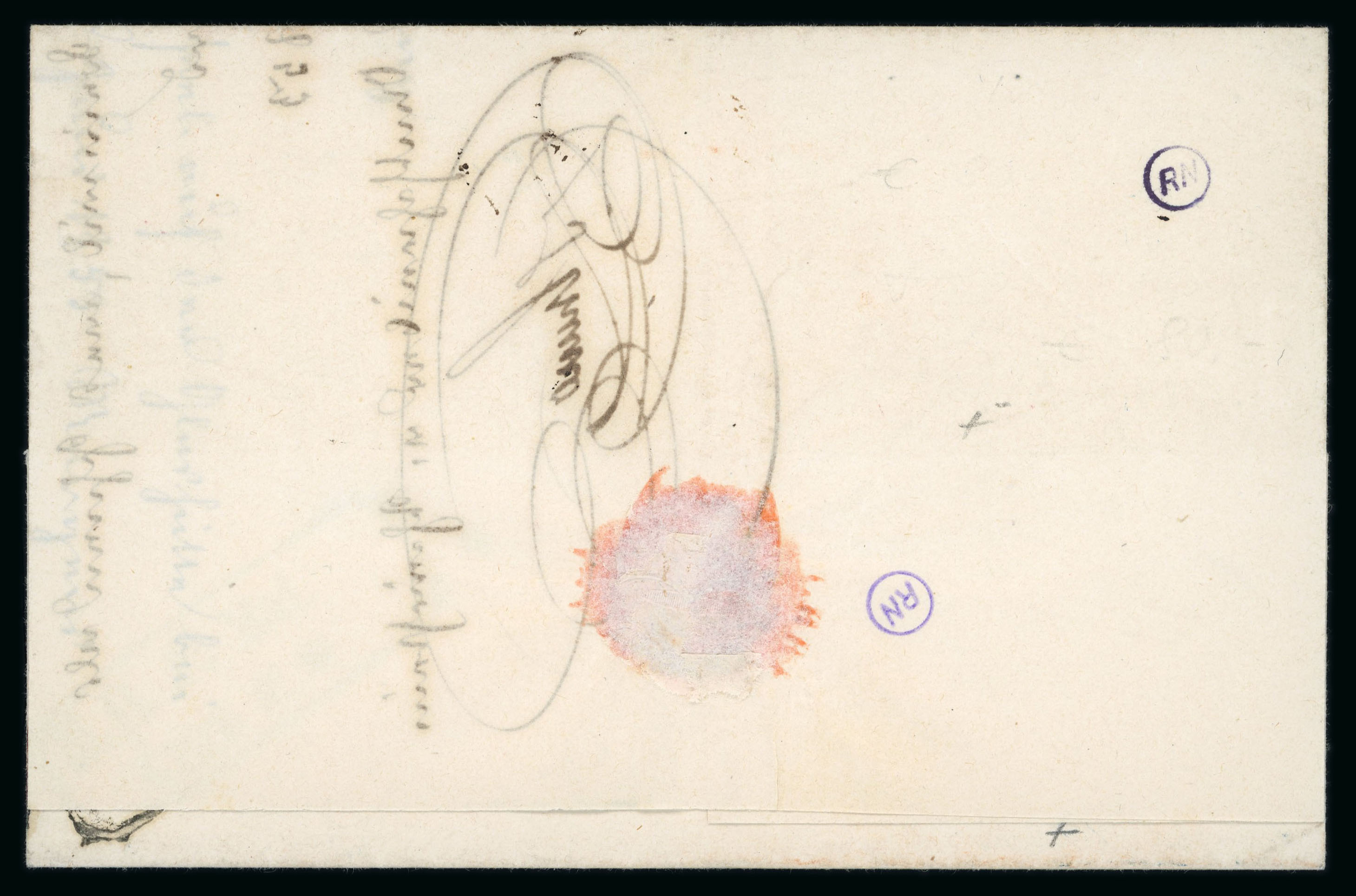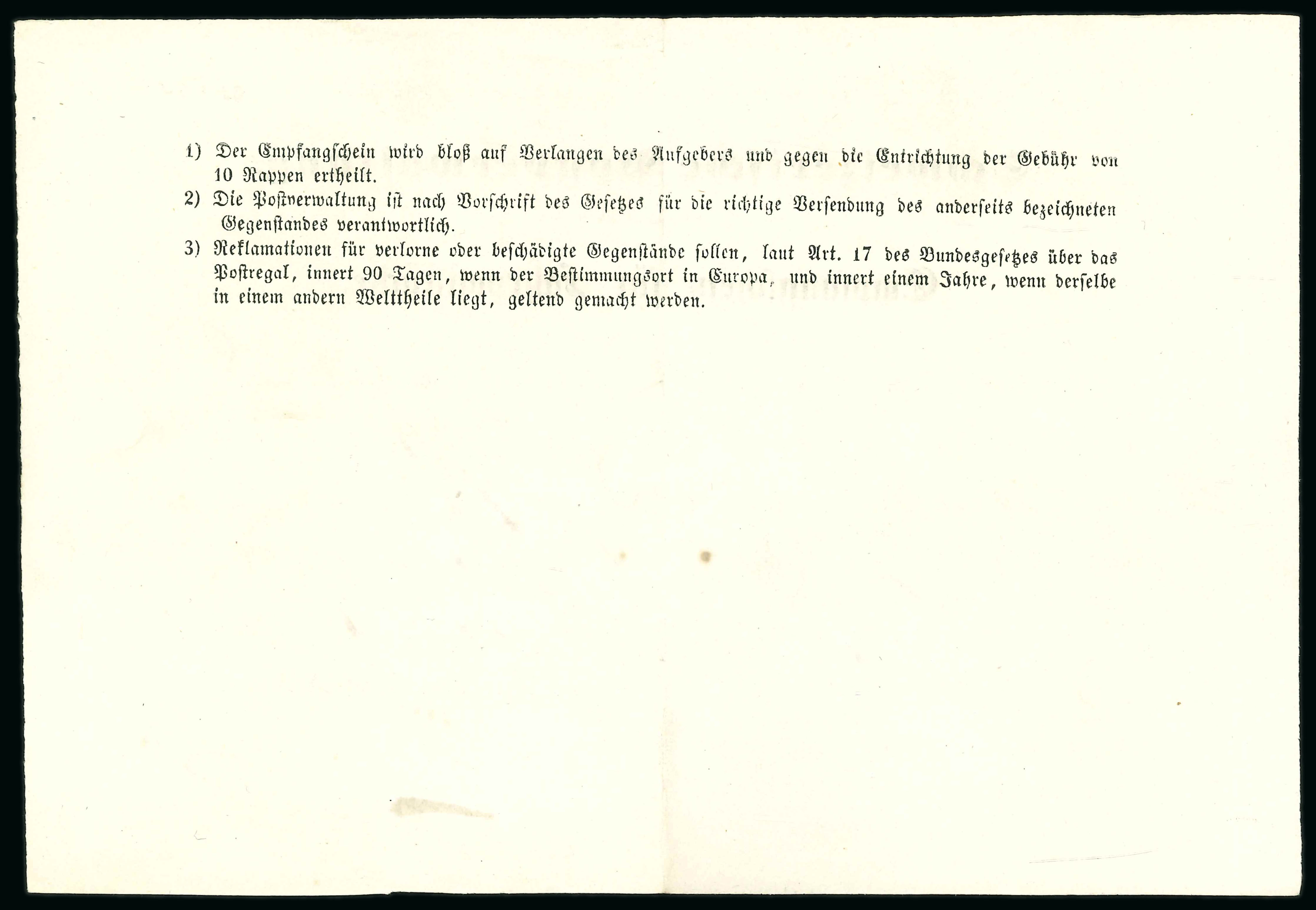 einen Brief nach Württemberg, sowie 20 Rp. als Einschreibegebühr. Eine äusserst seltene Verwendung eines Leerabschlags, wahrscheinlich zur Kennzeichnung des bezahlten Portos. Laut Schäfer ist dieser Brief der einzige Auslandsbrief mit Leerabschlag