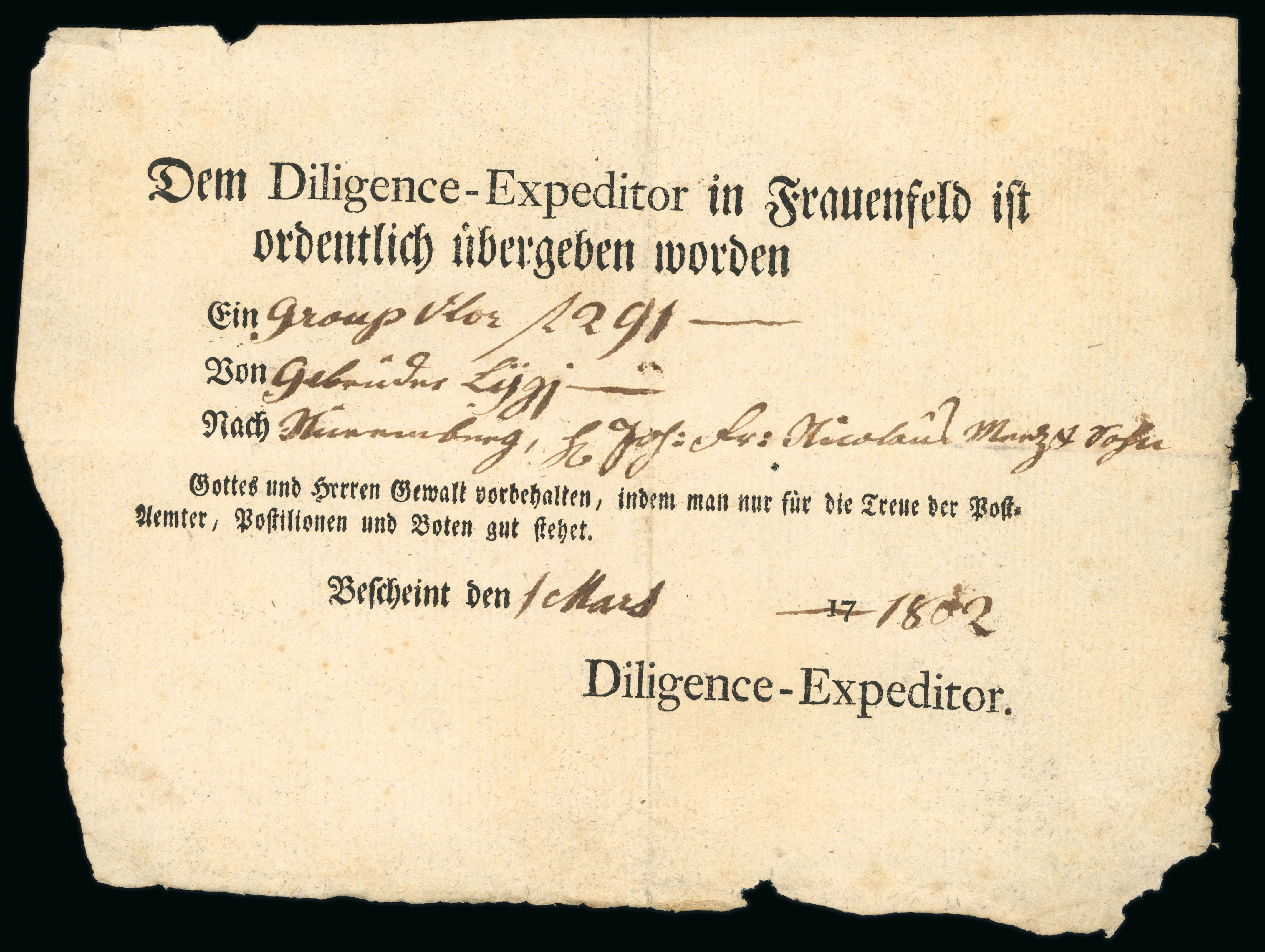 1802, Postschein des « Diligence-Expeditor » von Frauenfeld (Thurgau). Eine postgeschichtliche Seltenheit. (Image 1)