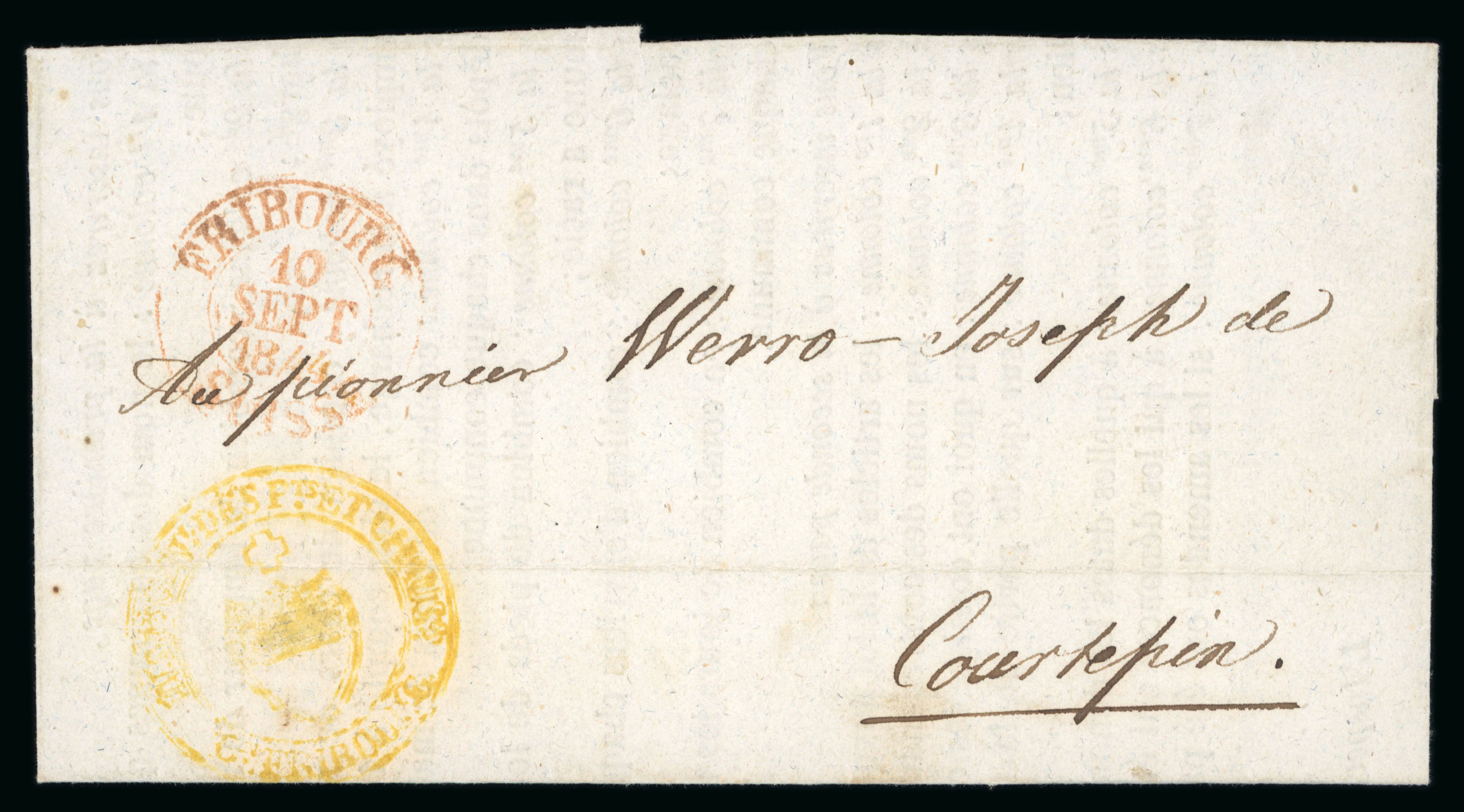 1844, Drucksache von Fribourg nach Courtepin mit gelbem Stempel « FRIBOURG 10 SEPT 1844 SUISSE » und gelber « INSPECTEUR DES PONTS ET CHAUSSEES CANTON FRIBOURG ». Gelbe Stempel sind sehr selten. (Image 1)