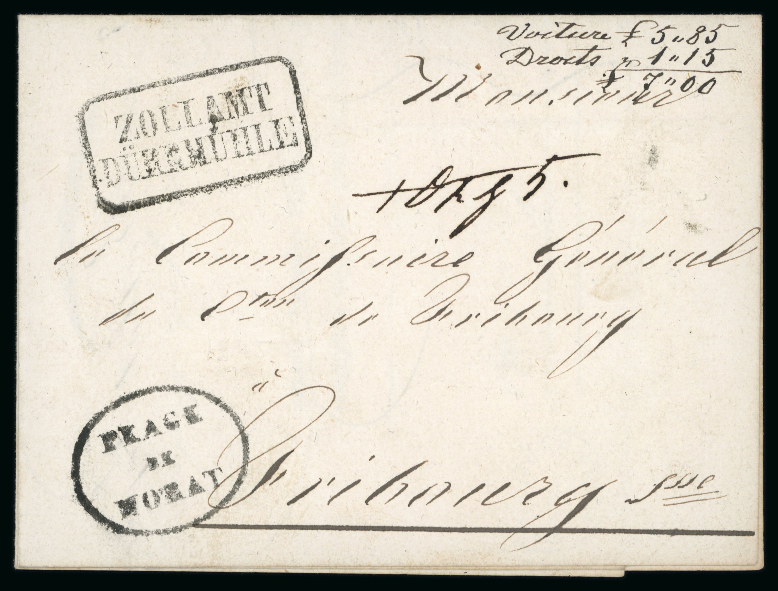 1845, Rückzahlung von Basel nach Freiburg, mit Stempel « ZOLLAMT DÜRRMÜHLE » sowie « PÉAGE DE MORAT ». Ein interessanter Brief, welcher über Zoll und Péage gelaufen ist. (Image 1)