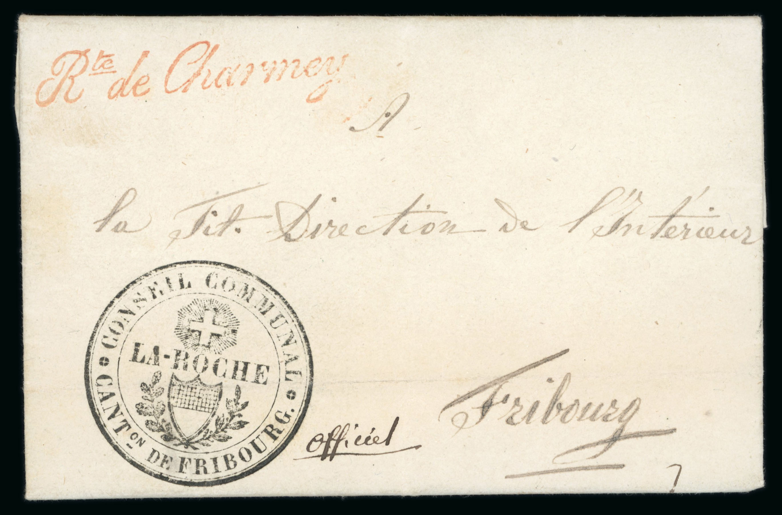 1852, Brief von La Roche nach Fribourg, mit Route Stempel « Rte de Charmey » und wunderschönem « CONSEIL COMMUNAL LA ROCHE CANTON DE FRIBOURG ». Ein wunderschöner Brief. (Image 1)
