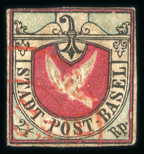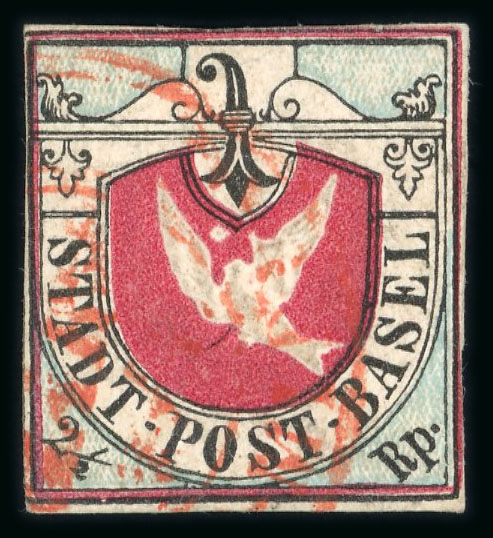 1845, Basler Taube, farbfrisch, dreiseitig weissrandig, obere Einfassungslinie touchiert, rückseitig dünn, klar entwertet mit Teilen eines roten Zweikreisstempels Basel. Signiert Pigeron, Papadopoulos (bekannter französischer Händler),