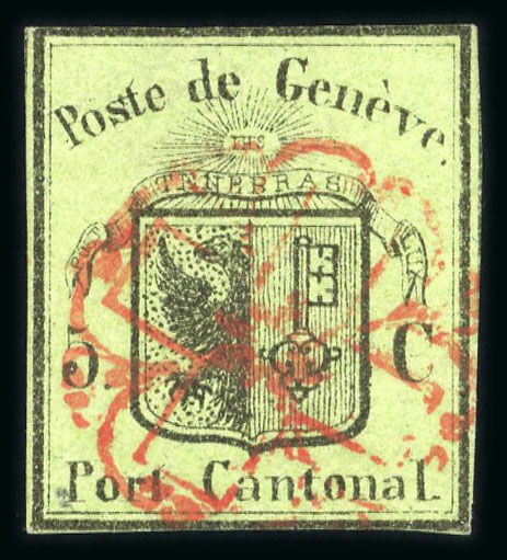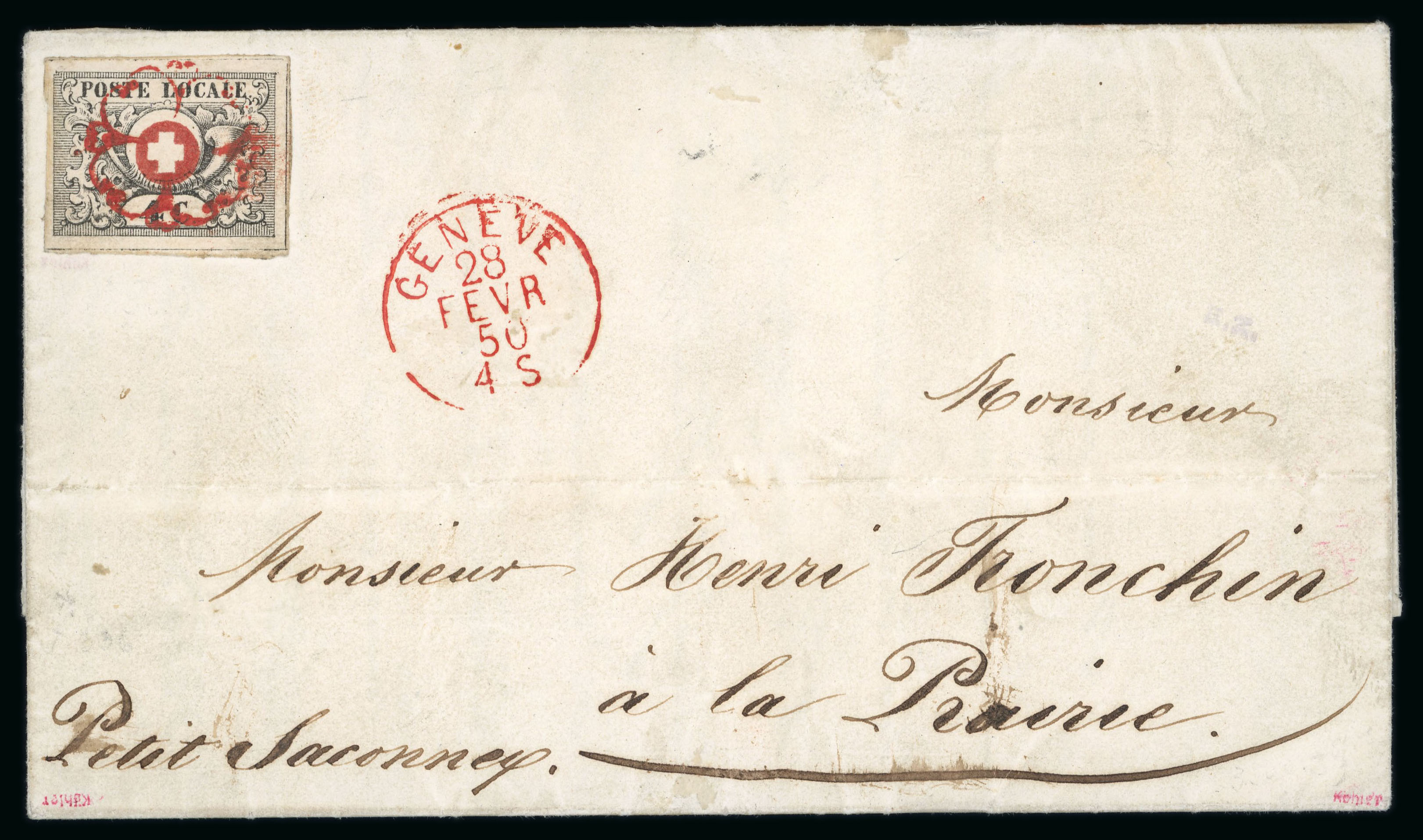 1849, grosser Adler dunkelgrün, farbintensiv, oben links lupenrandig, sonst allseits breitrandig geschnitten, auf Stadtbriefvorderseite von Genf, dekorativ und ideal entwertet mit roter Genfer Rosette (AW4) und nebengesetzt « GENEVE 15