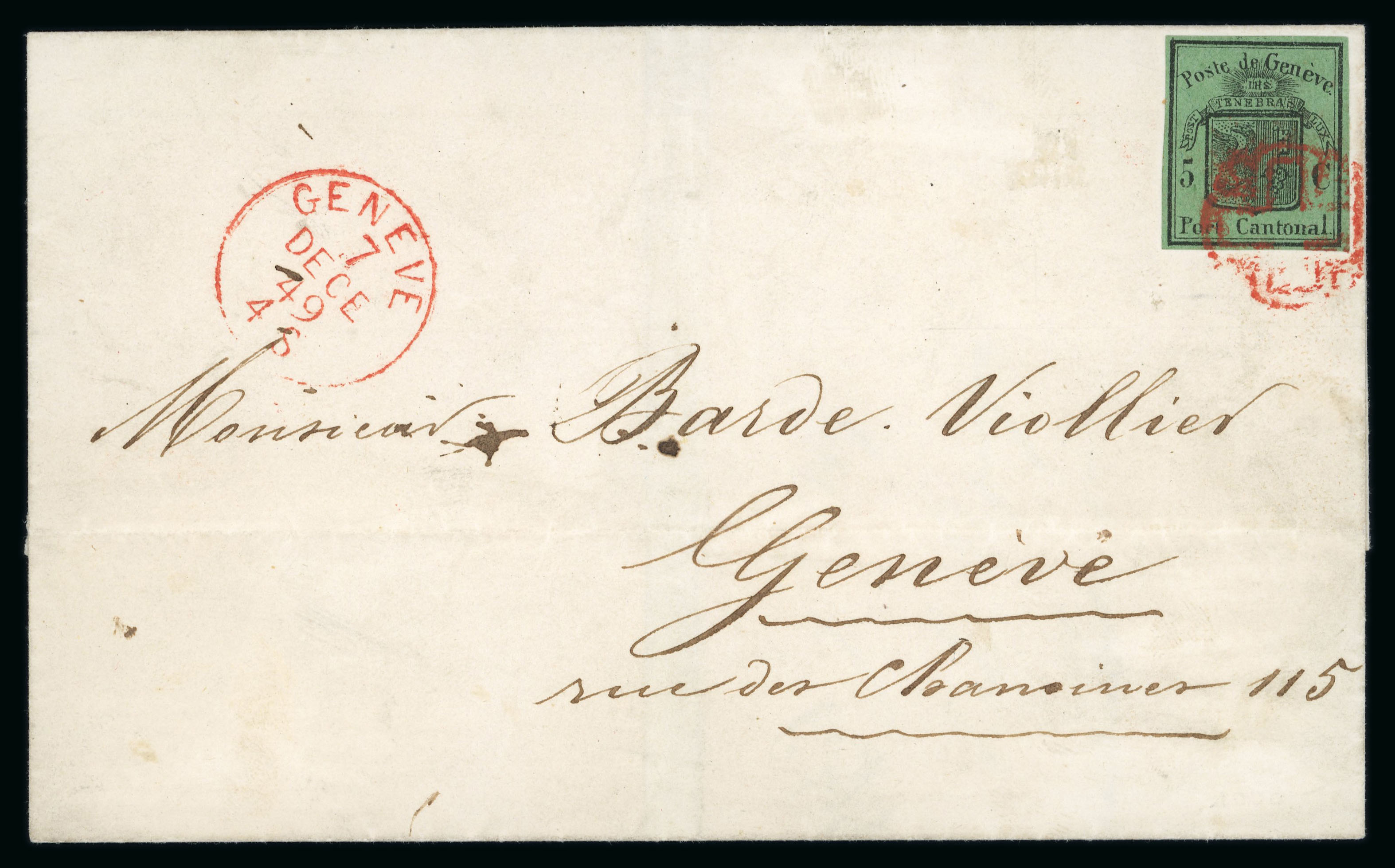 1849, grosser Adler dunkelgrün, farbintensiv, allseits breitrandig geschnitten, auf Stadtbrief von Genf, sauber und dekorativ entwertet mit übergehender roter Genfer Rosette (AW5) und nebengesetzt « GENEVE 7 DECE 48 4 S ». Ein