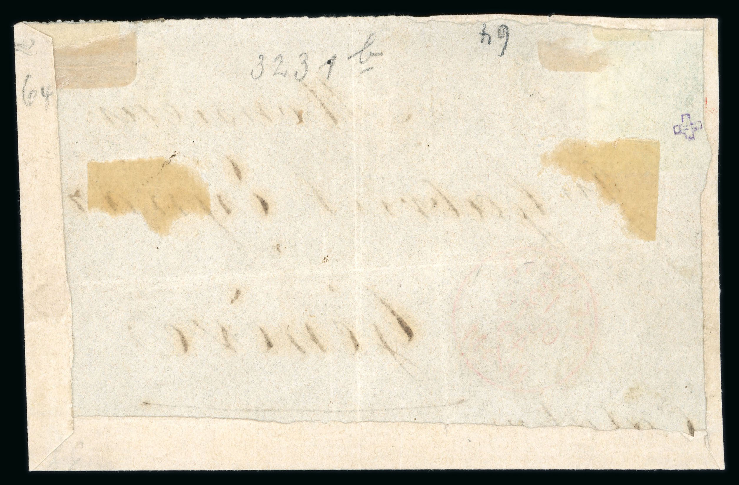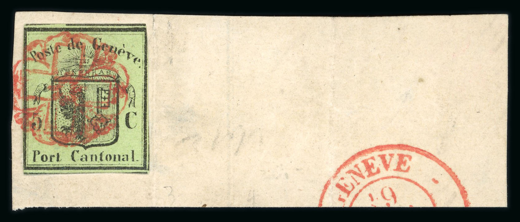 1849, Genfer Ganzsachenaussschnitt auf kleinem Briefstück (abgelöst und wieder aufgefalzt), allseits breite Ränder, leicht entwertet mit roter Genfer Rosette (AW3). Ein schönes, seltenes Stück. Signiert Zumstein und Köhler, Attest