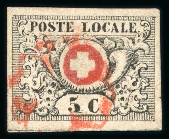 1850, Orts-Post mit Kreuzeinfassung, Type 2, farbfrisch und allseits überrandig geschnitten, entwertet mit klar gesetzter schwarzer eidgenössischer Raute. Eine schöne Marke. Attest Rellstab 1994. SBK = CHF 2300. (Image 1)
