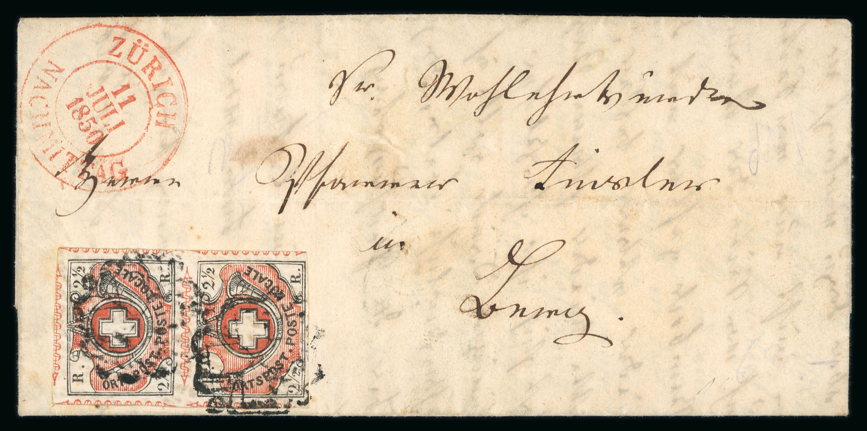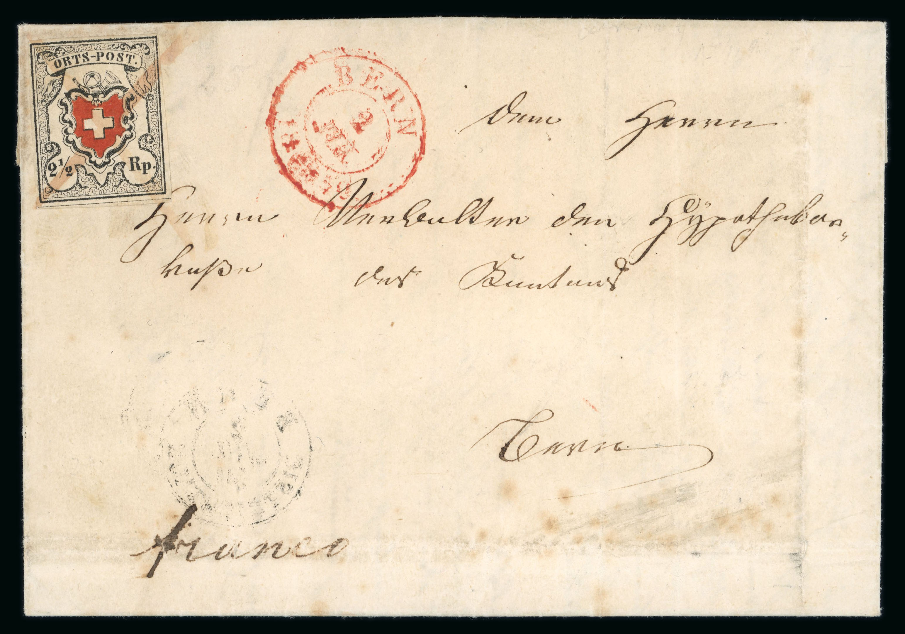 1850, Orts-Post mit Kreuzeinfassung, Type 18, farbfrisch, allseits voll- bis breitrandig geschnitten, auf Brief von Istewald, privat nach Bern befördert und dort als Stadtbrief verwendet, übergehend entwertet mit rotem Rötelkreuz und