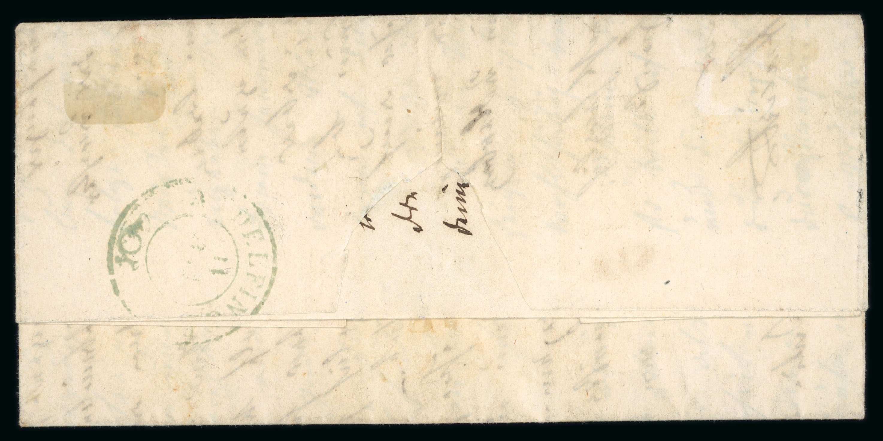 nebengesetzt « BERN 2 JUIL 1850 », sowie vorder- und rückseitig schwarzer Stempel « BERN 2 JUL 50 DISTRIBUTION ». Eine äusserst seltene Verwendung der Orts-Post Marke vor dem 1. Oktober 1850, welche aber schon am 1. Mai an die Postämter geliefert