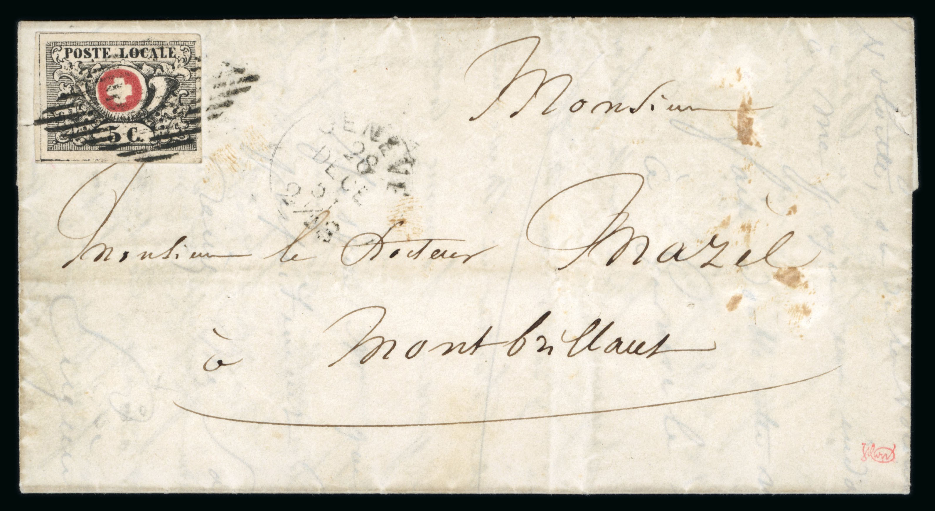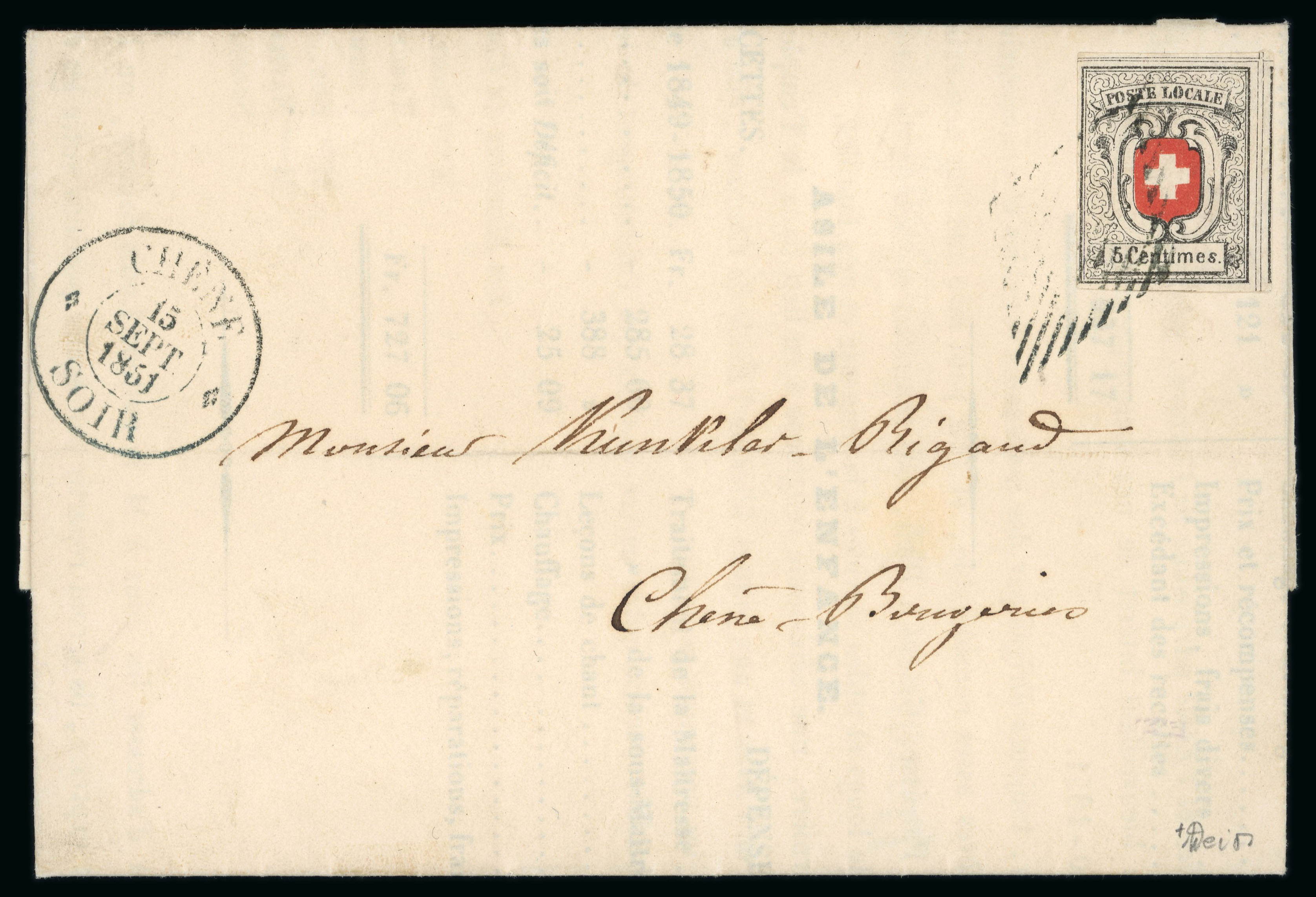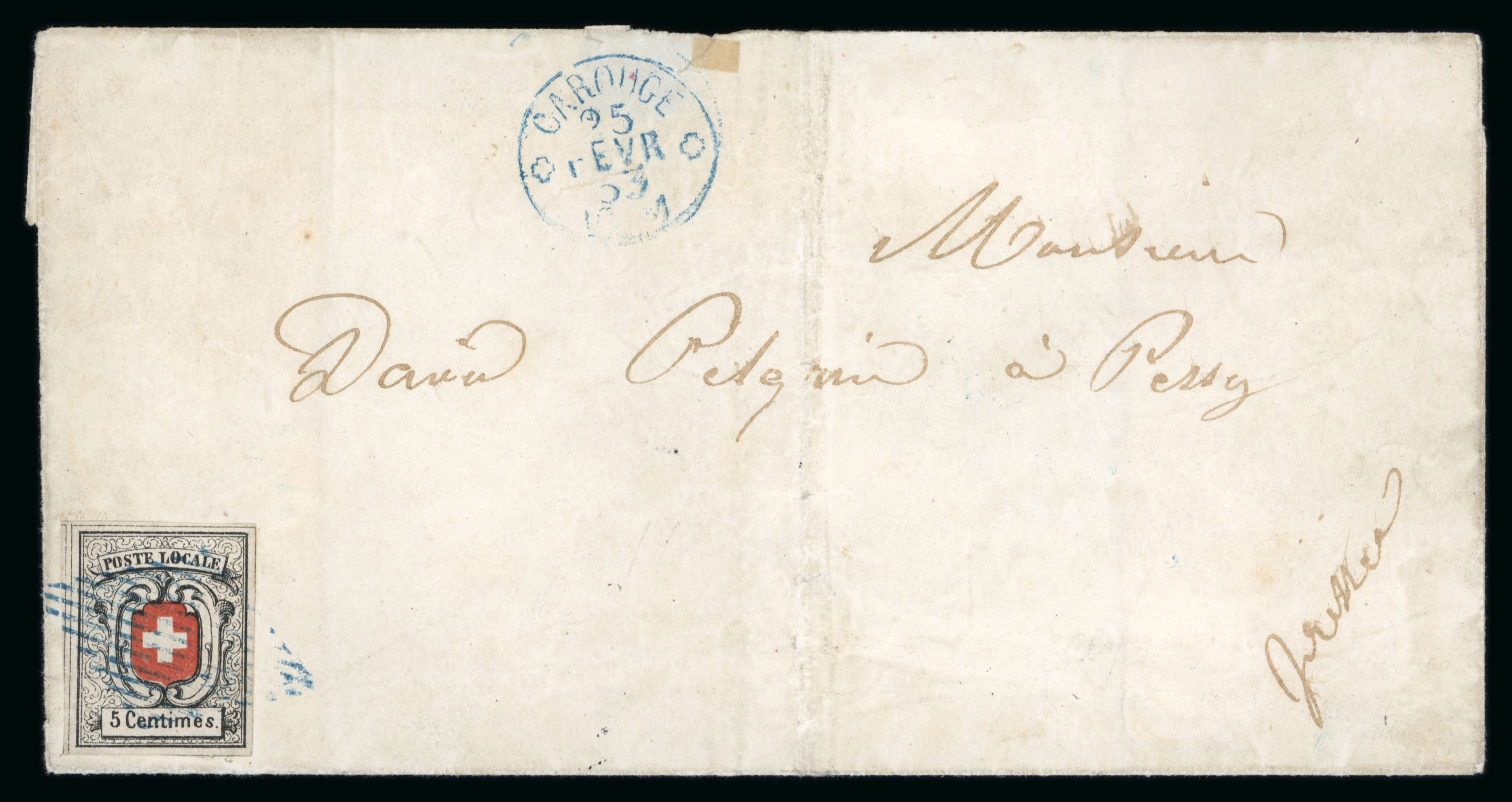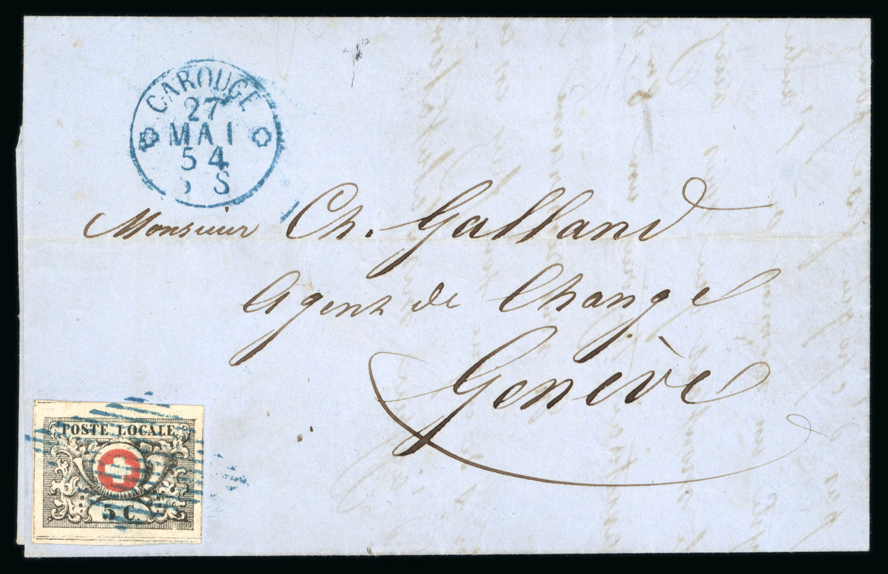 Carouge und nebengesetzt « CAROUGE 27 MAI 54 3 S », rückseitig Ankunftsstempel Genf vom gleichen Tag. Eine sehr späte Verwendung der Waadt 5 im letzten Jahr, sowie eine rarissime Verwendung von Carouge. Laut Schäfer ist nur dieser Brief von Carouge