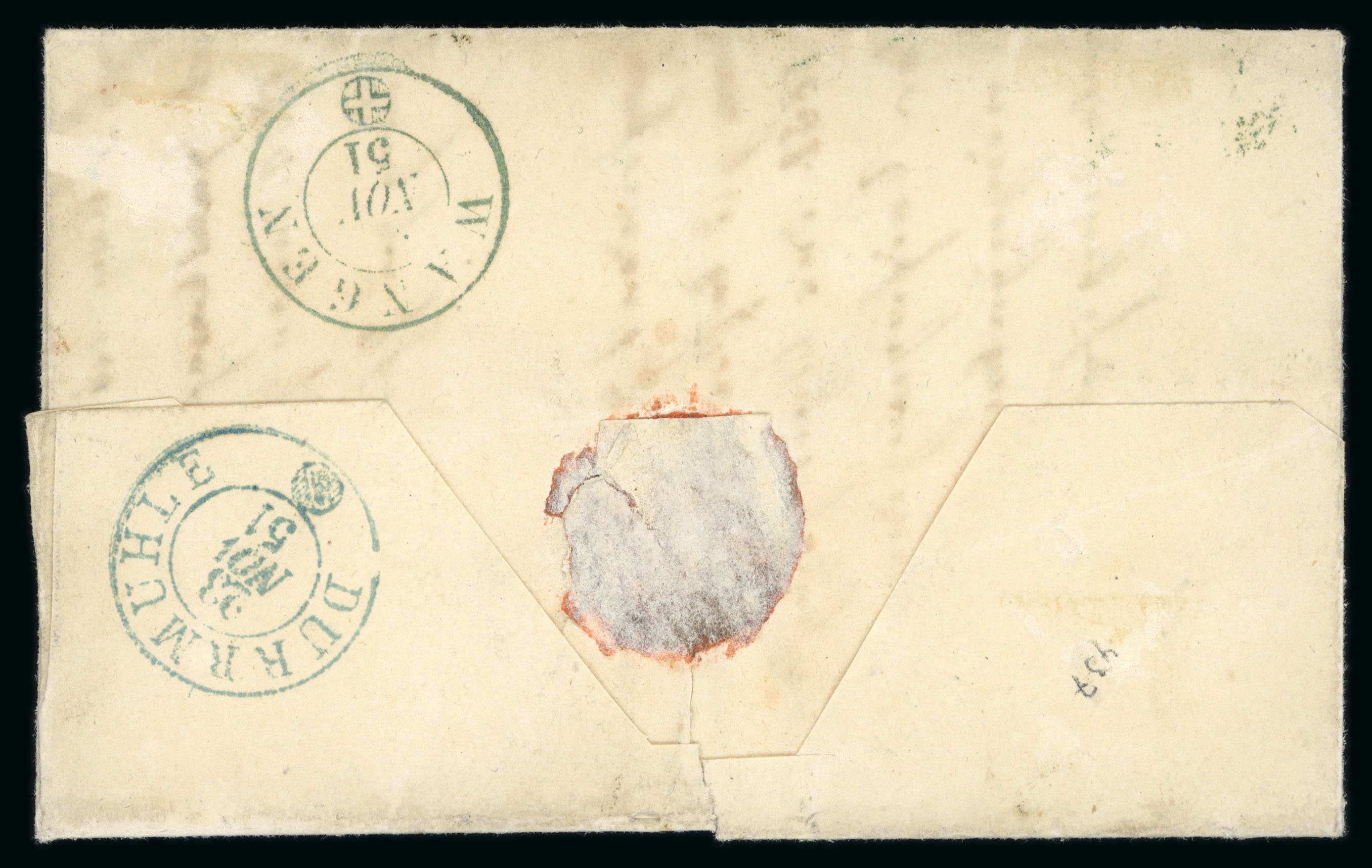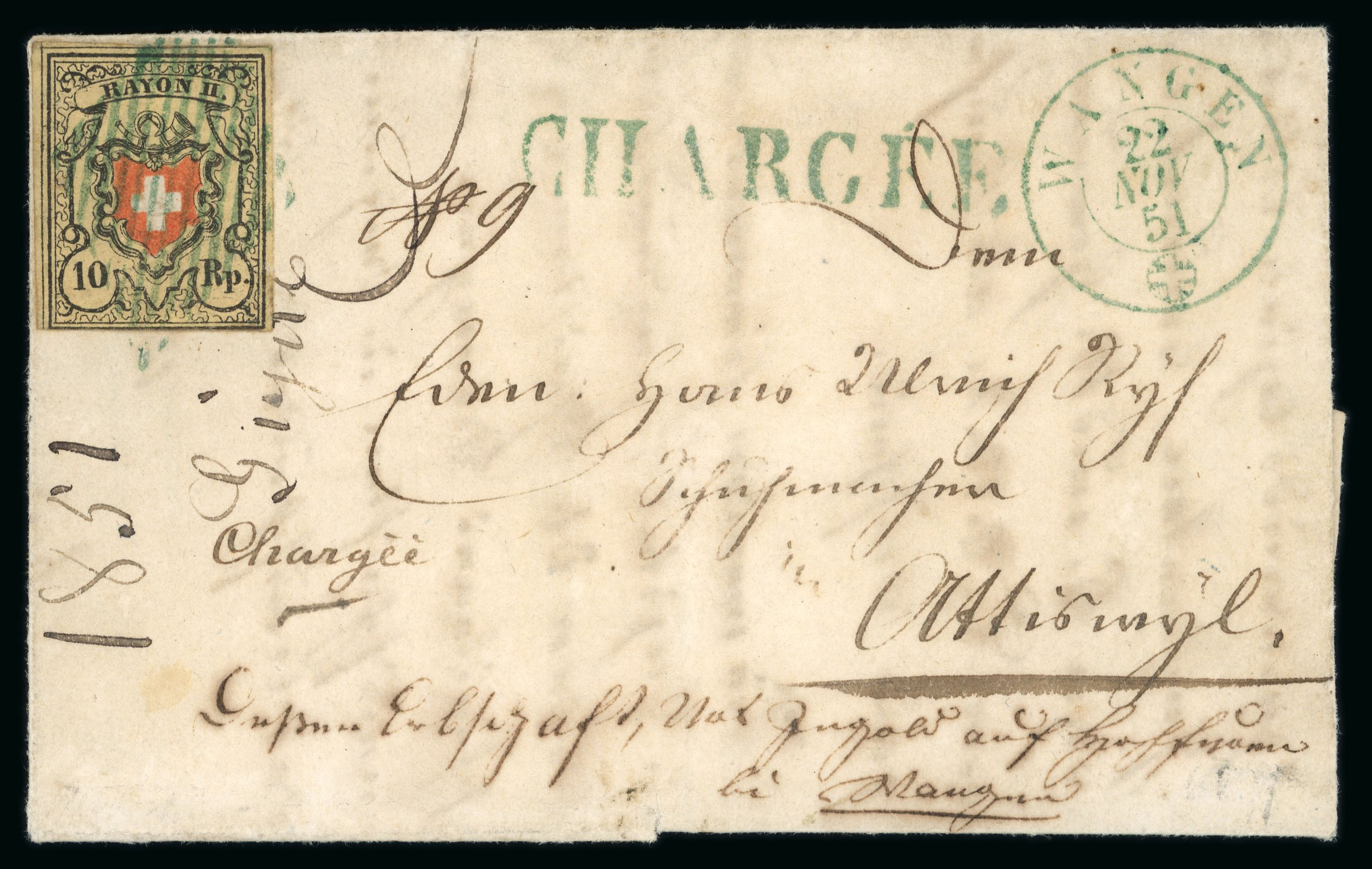 nebengesetzt « CHARGEE » und « WANGEN 22 NOV. 51 » in der gleichen Farbe, rückseitig Wangen wiederholt und Transitstempel Durrmuhle. Ein bestechend schöner Brief dieser grossen Stempelrarität. Atteste Nussbaum 1964, Zumstein 1994. (Image 1)