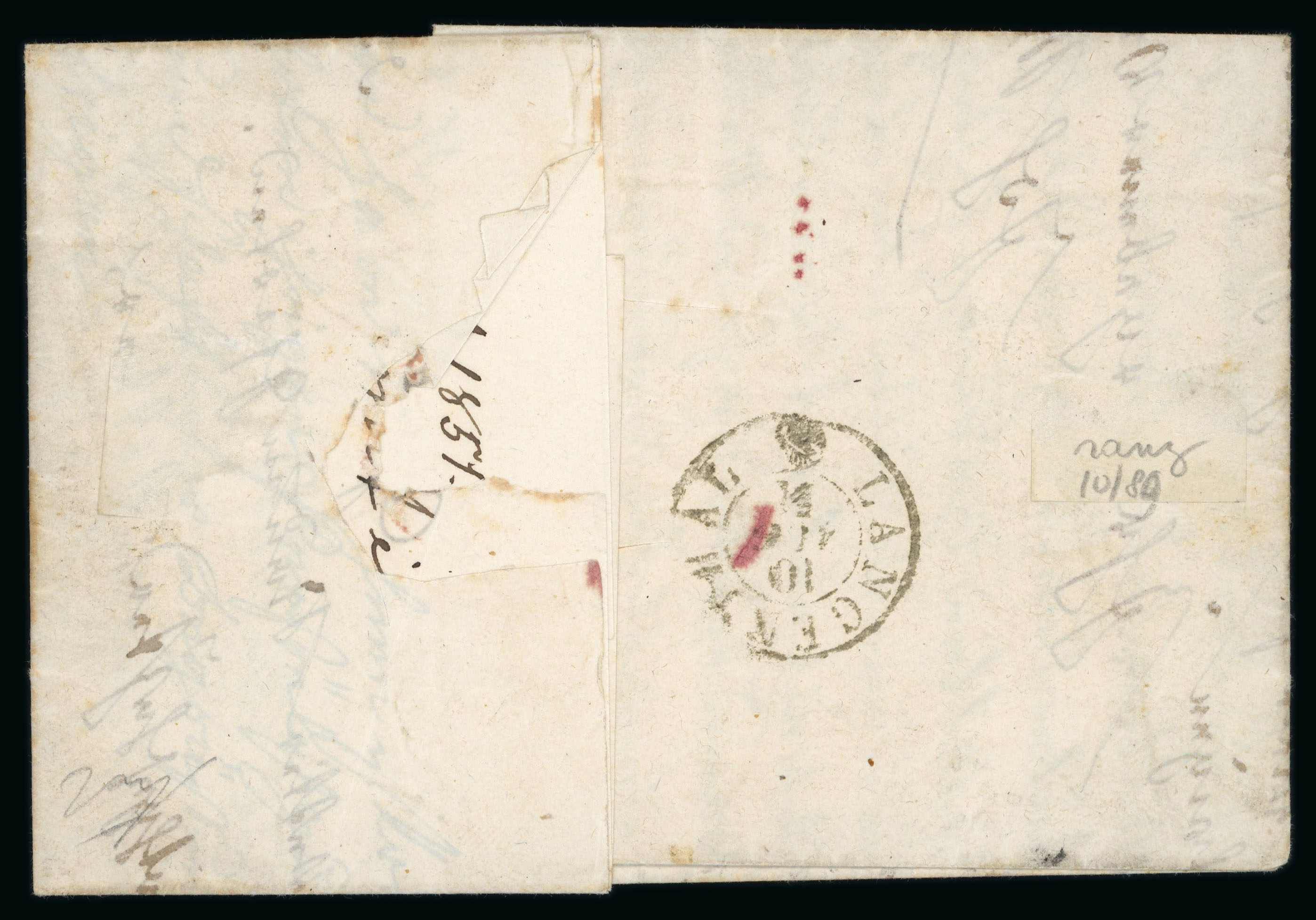 1851, Rayon II im waagerechten Dreierstreifen, Typen 37-38-39, Stein A2-RU, farbintensiv, rechte Marke zweiseitig angeschnitten, sonst allseits breitrandige Einheit, unten mit Bogenrand, auf Faltbrief von Luzern nach Genf, klar und