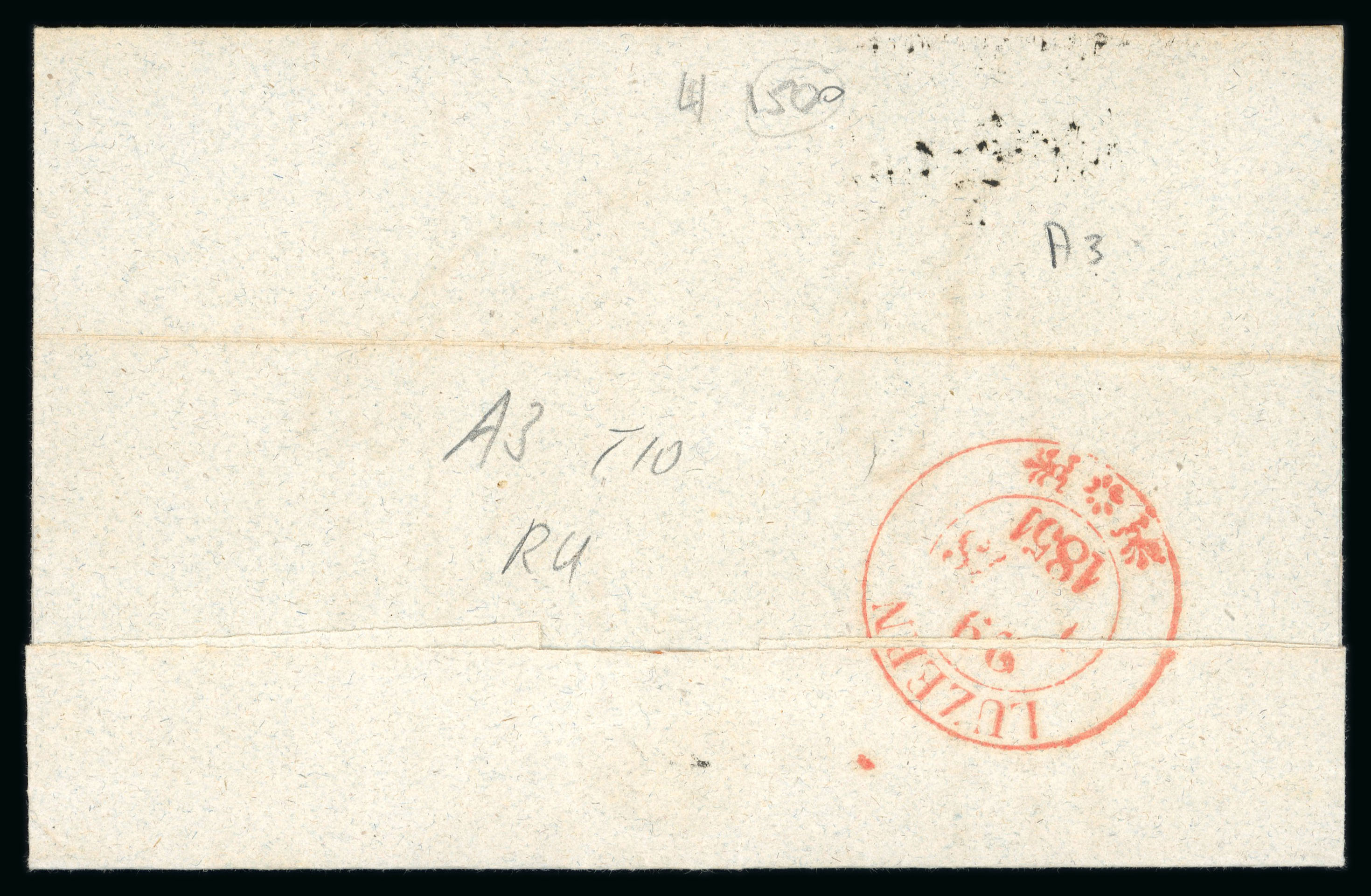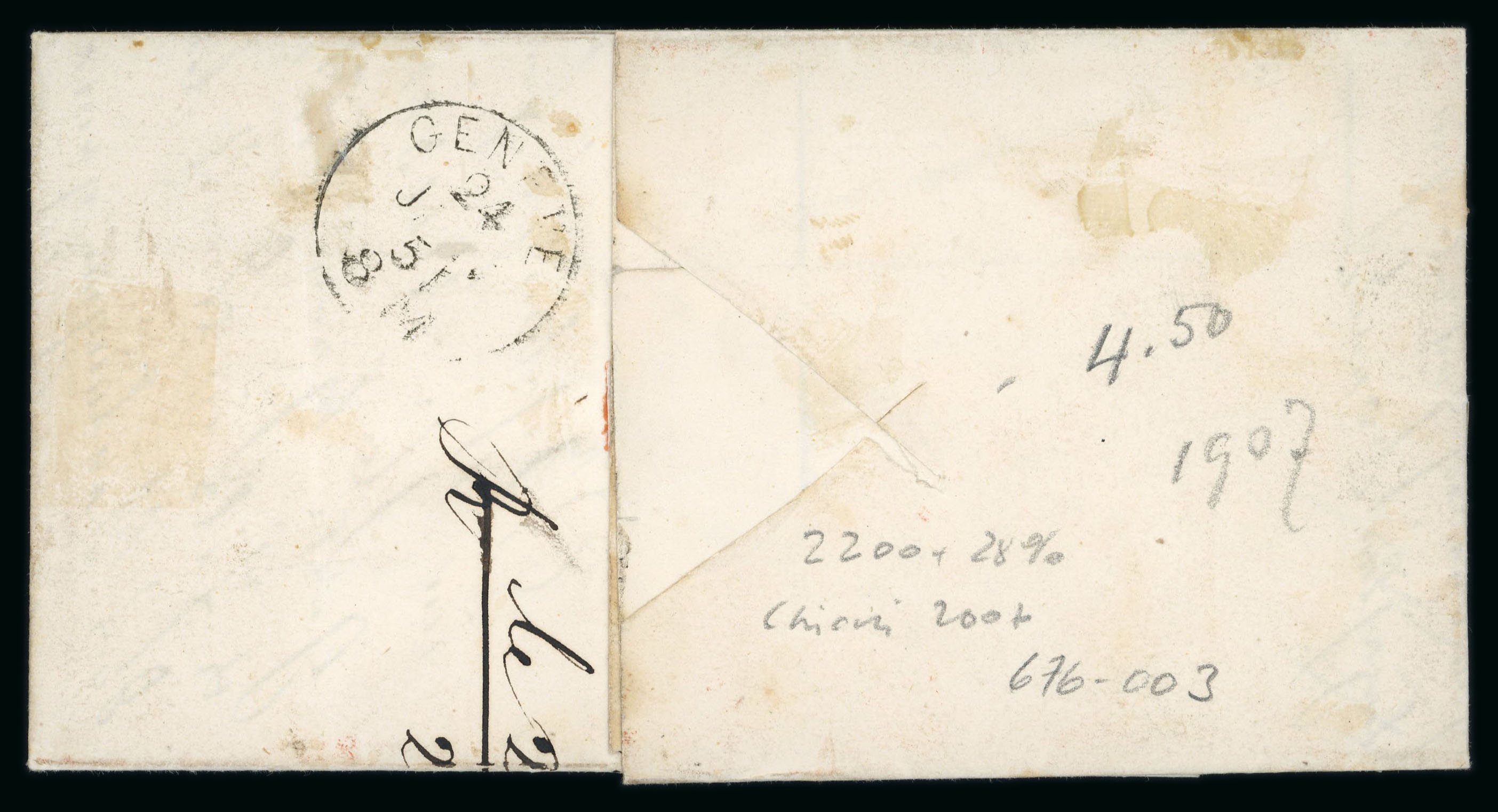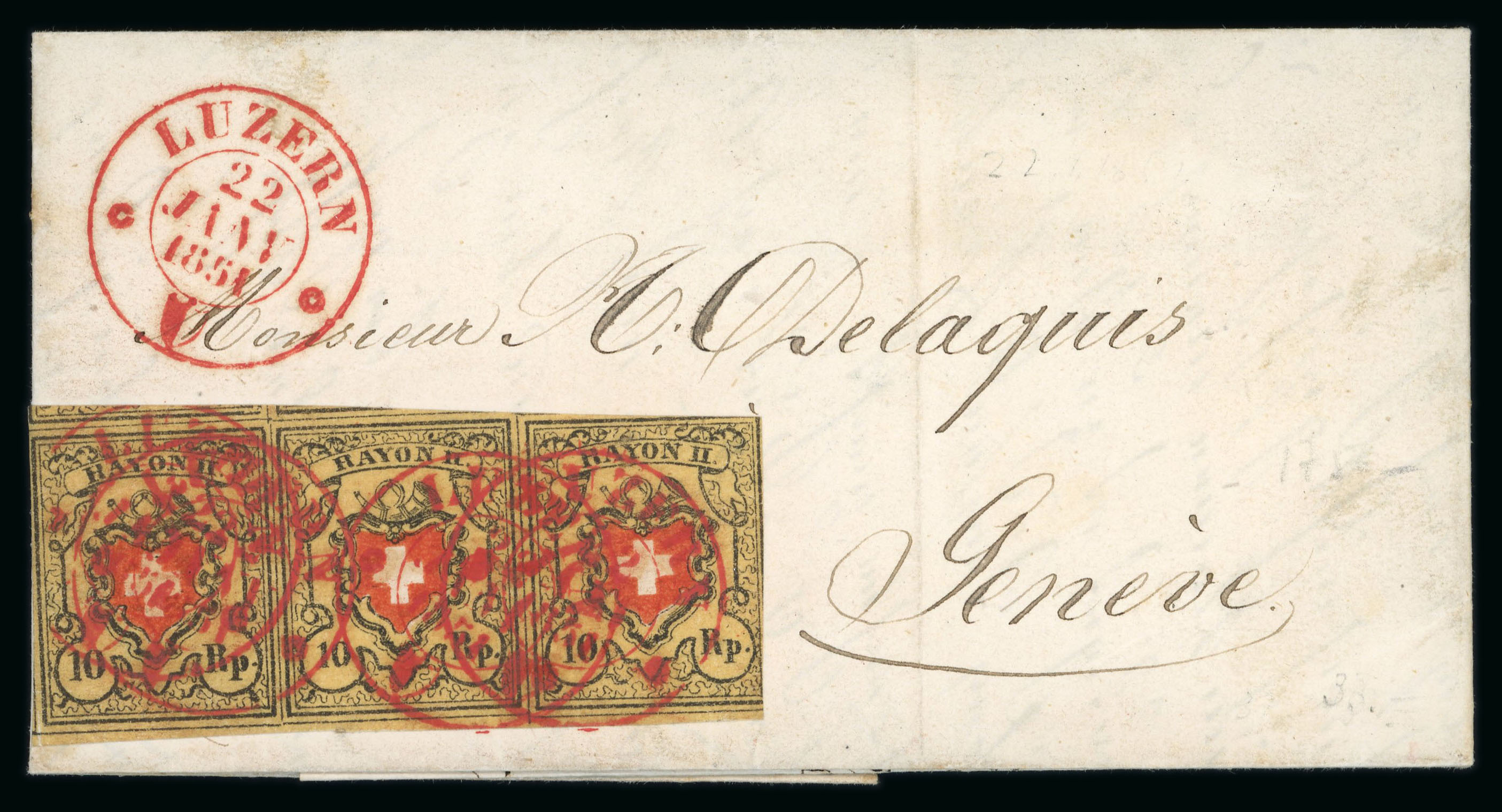 dekorativ entwertet mit 4 Abschlägen des roten Zweikreisstempels « LUZERN 22 JANV 1851 » und nebengesetzt wiederholt, rückseitig Ankunftsstempel Genf. Eine seltene Frankatur im IV. Briefkreis (über 20 Wegstunden) der 2. Gewichtsstufe, laut Schäfer