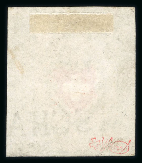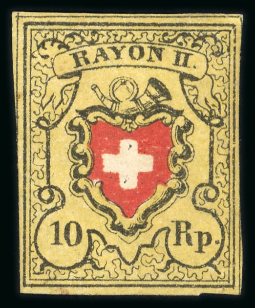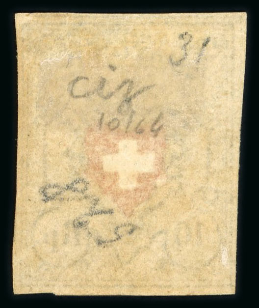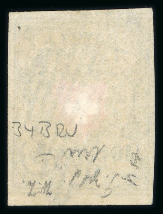 1850, Rayon II, Type 34, Stein B-RU, farbfrisch, allseits überbrandig geschnitten, mit unterem Bogenrand, Trennlinien auf allen Seiten sichtbar, dekorativ entwertet mit schwarzer eidgenössischer Raute. Befund Marchand 2014. SBK = CHF 350.