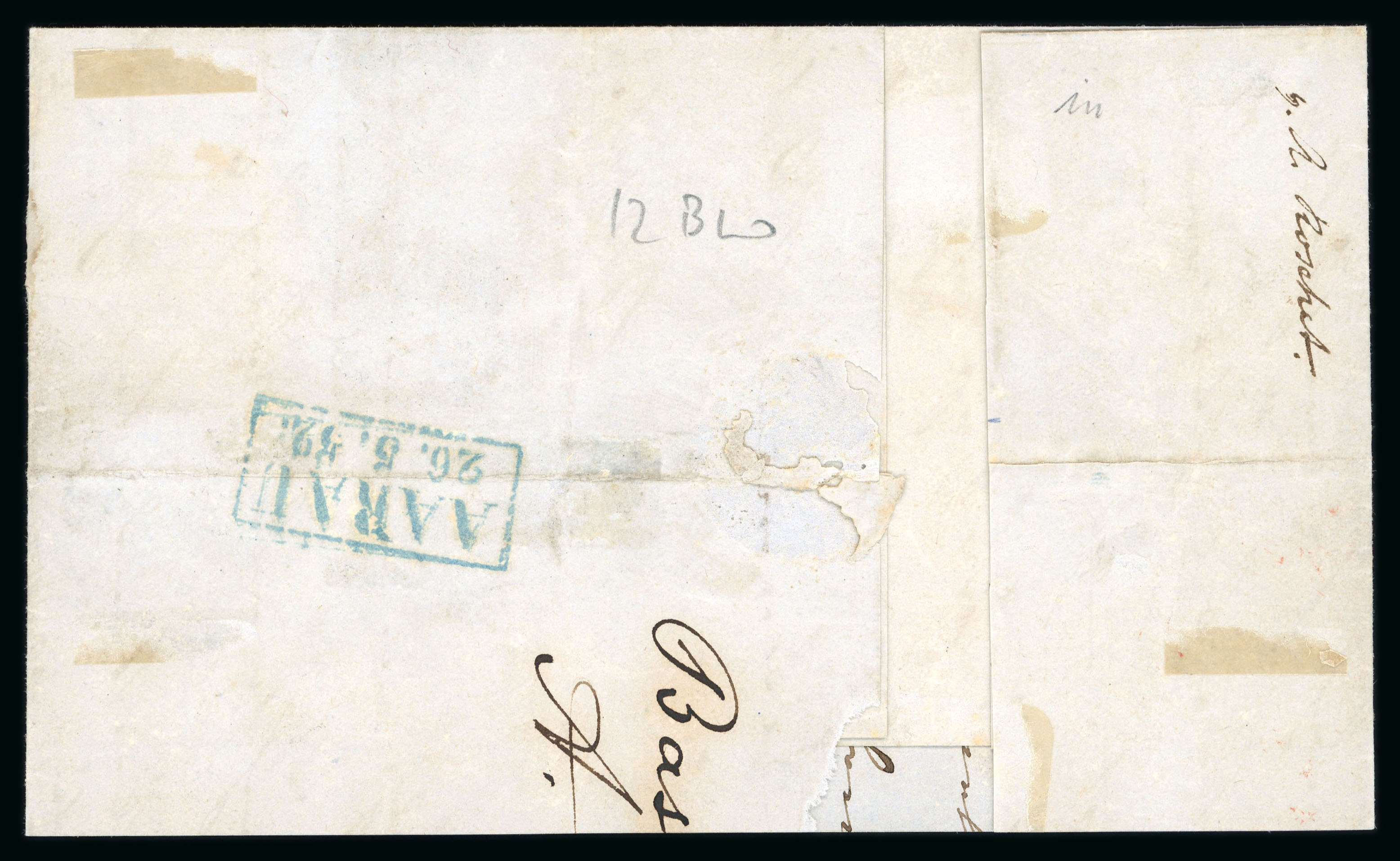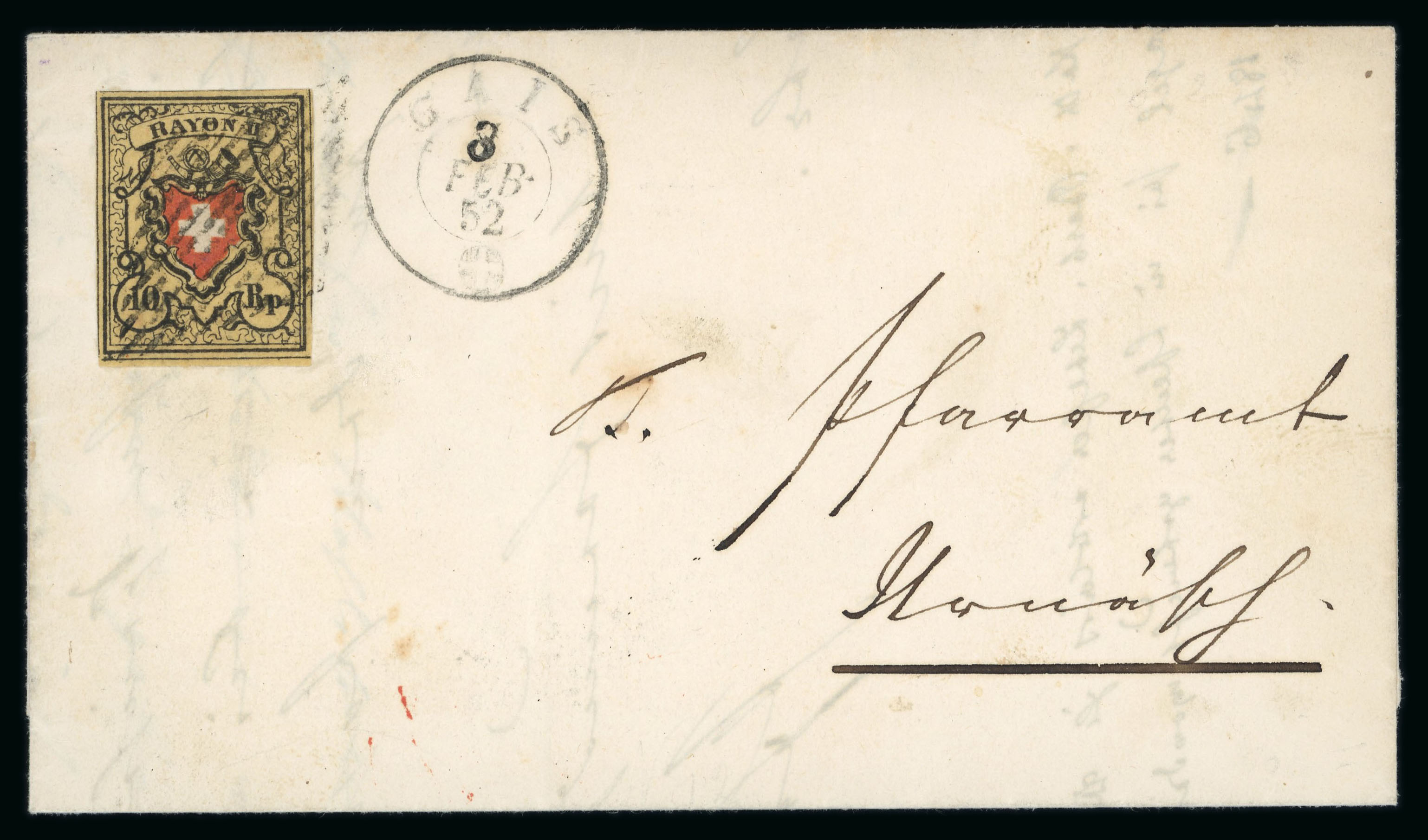 1852, Rayon II, Type 12, Stein B-LO zusammen mit Rayon III kleine Wertziffern, Type 6, farbintensiv, Rayon II unten berührt, sonst beide allseits voll- bis breitrandig, auf Nachnahme-Faltbrief von Basel nach Aarau, klar, übergehend und
