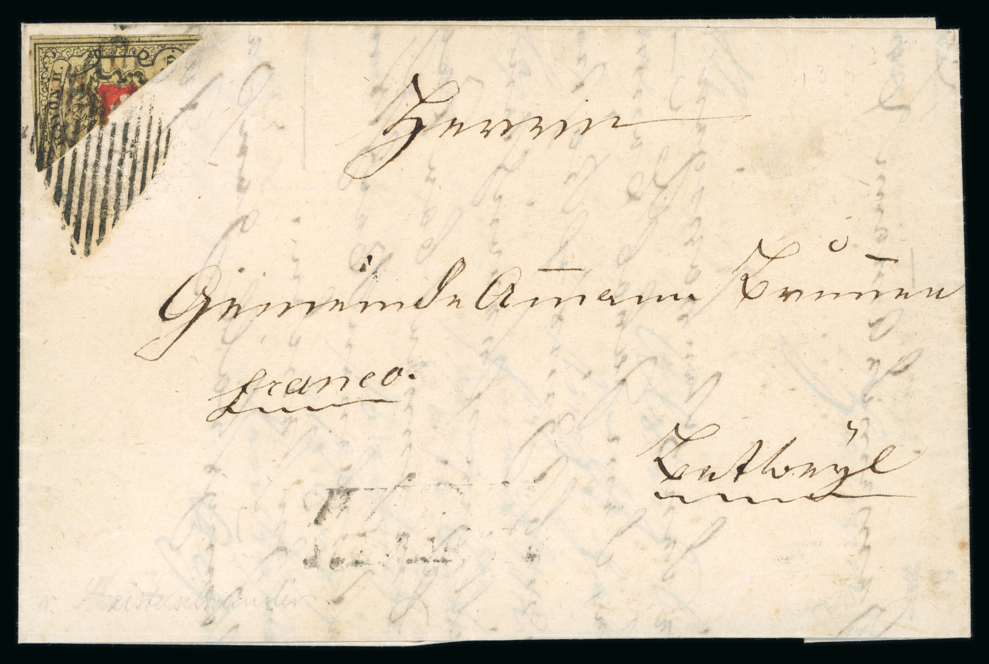 1850, Rayon II, Type 29, Stein D-RO, diagonale Halbierung, farbintensiv, allseits voll- bis breitrandig, auf Faltbrief von Meisterschwanden nach Bettwil, zuvor entwertet mit 3 verblassten Tintenstrichen, sowie später übergehende schwarze