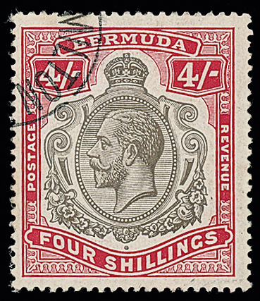 341 Used imageBermuda: 1918-22 Watermark Mult. Crown CA 4s. black and carmine variety nick in top right scroll, used, fine. S.G. 52bc, cat. £650. Photo. (Image1)