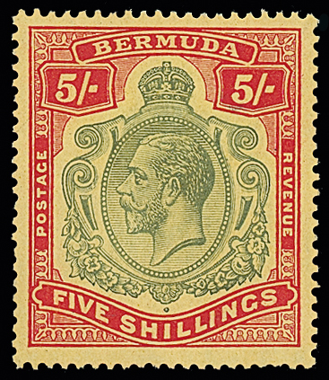 342 nh imageBermuda: 1918-22 Watermark Mult. Crown CA 5s. green and carmine-red on pale yellow, variety break in lines below left scroll, fine mint. S.G. 53de, cat. £400. Photo. (Image1)